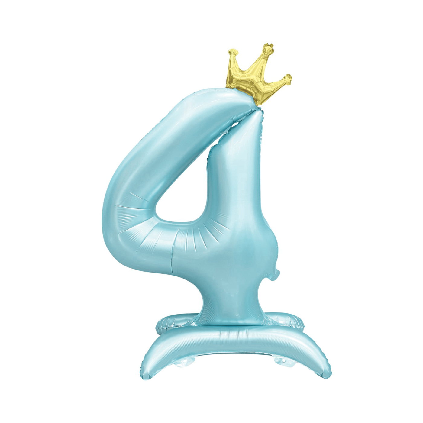 Stojící fóliový balónek ve tvaru světle modré číslice 4 s korunkou je ideální jako efektní výzdoba narozeninové párty nebo oslavy významného jubilea. Jednotlivé číslicové balónky můžete kombinovat pro vytvoření potřebného čísla. Výška: 82 cm Materiál: fólie se saténovou úpravou Balení obsahuje: 1 ks balónku a papírové brčko pro snadné nafouknutí Balónky je možné nafukovat pouze vzduchem.