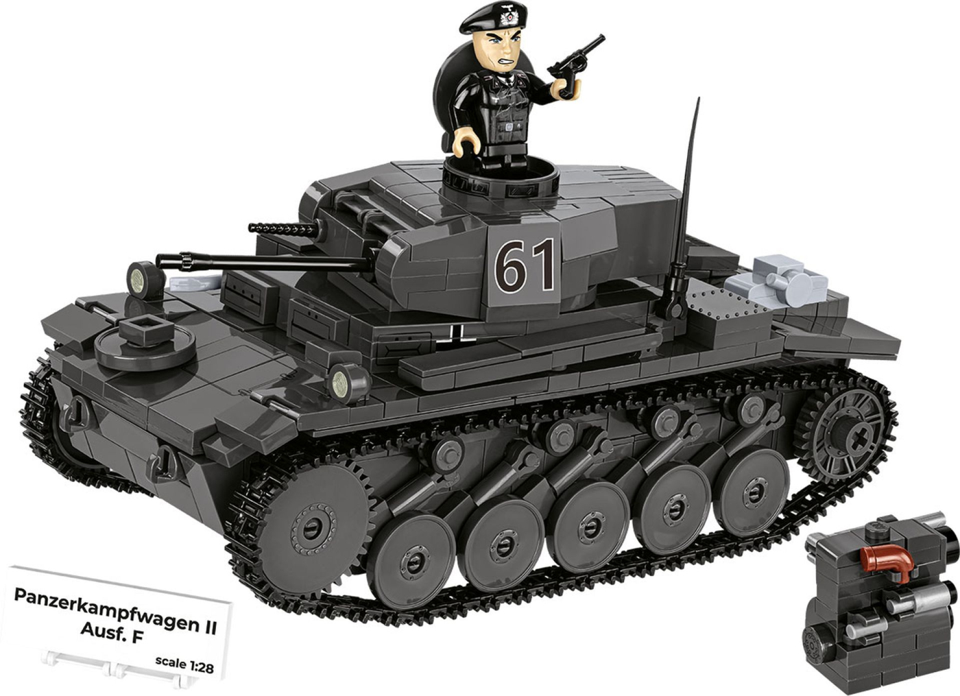 Postavte si model tanku Panzerkampfwagen II byl jedním z nejdůležitějších německých tanků v počáteční fázi 2. světové války. Panzer II Ausf. F je německý lehký tank,nejintenzivněji používaný v počáteční fázi 2. světové války. Jedná se o jednu z pozdějších vývojových verzí tohoto vozidla. Vyráběl se od roku 1941. Ausf verze F měl silnější pancíř (vpředu až 35 mm), což zvýšilo ochranu posádky. Jeho výzbroj zahrnovala 20mm kanón a kulomet MG 34 Přestože byl Panzer II navržen především jako průzkumný tank, byl hojně využíván při taženích v Polsku, Francii a na východní frontě. Postupem času, kdy jeho zbraně a brnění zastaraly, plnil především podpůrné a výcvikové funkce. Balení obsahuje 813 kostek a 1 figurku.