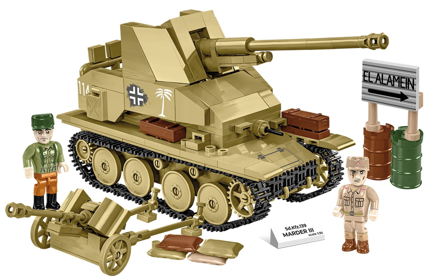 Postavte si model Stíhač tanků Marder III bojoval na mnoha frontách druhé světové války. Až do zavedení 88mm děl to byla velmi nebezpečná protitanková zbraň. Design Sd.Kfz. 139 byl založen na podvozku Panzer 38(t). Hlavní výzbroj tvořilo upravené sovětské dělo, přizpůsobené německým granátům - 7,62 cm PaK 36(r). MARDER III v sadě s přiloženým základním německým 5cm kanónem Pak 38. Balení obsahuje 486 kostek a 2 figurky.