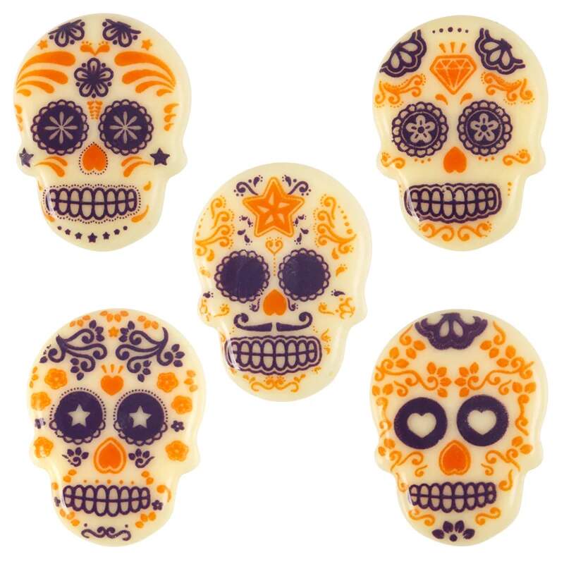 Čokoládová dekorace na halloweenské zdobení cukroví, dezertů, zákusků, pohárů apod. Balení obsahuje 12 ks. Mix vzorů. Velikost cca 3,9x2,3 cm. Složení: cukr, kakaové máslo, sušené odstředěné mléko, bezvodý mléčný tuk, emulgátor (E322 (slunečnicový)), barviva (E101, E120,E132), aroma (přírodní vanilkové aroma). Může obsahovat stopy sóji. Výživové hodnoty (ve 100g výrobku): Energetická hodnota: 2527 KJ / 607 kcal; Tuky: 43,4 g z toho nasycené mastné kyseliny 26,8 g; Sacharidy: 47,5 g z toho cukry 47,3 g; Bílkoviny: 6,5 g; Sůl: 0,26g.