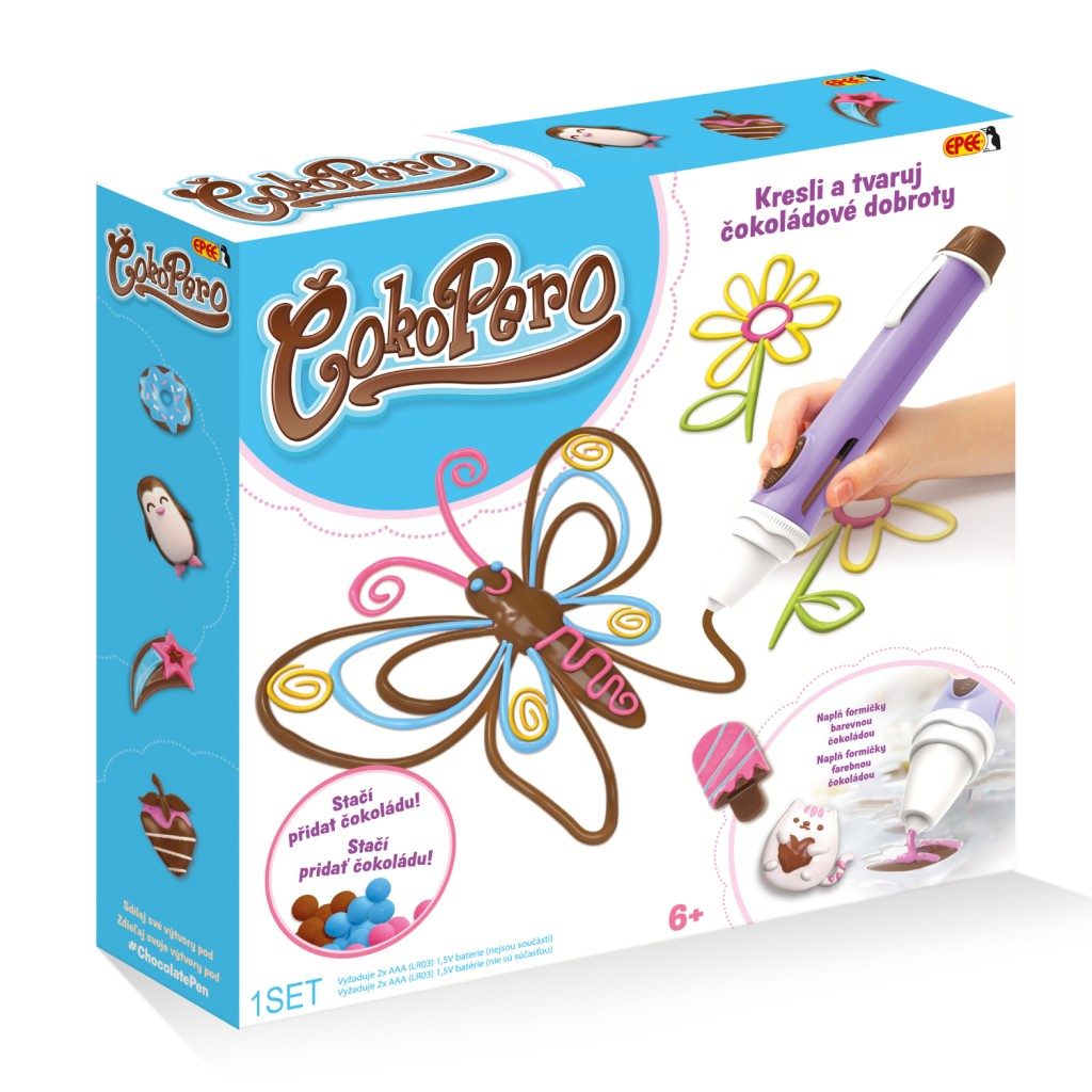 ČokoPero je kreativní sada určená pro děti od 6 let, která umožňuje originálním způsobem zdobit sladké dobroty pomocí čokolády. Tento produkt je ideální pro rozvoj fantazie a jemné motoriky, protože děti mohou psát, kreslit a vytvářet různé tvary z čokolády. Pero má ergonomický design v pastelové fialové barvě s hnědým uzávěrem, který připomíná čokoládovou bonboniéru, a je vybaveno tlačítkem pro snadné dávkování čokolády. Pro použití je potřeba vložit 2 baterie AAA, které nejsou součástí balení. Sada obsahuje samotné čokoládové pero, kreslicí hrot pro přesné linie a dvě průhledné formičky s celkem 50 různými motivy, které usnadní tvorbu zábavných postaviček jako jsou zvířátka, srdíčka, květiny nebo různé dekorace. Díky nim mohou děti snadno vytvořit originální ozdoby na sušenky, muffiny, ovoce nebo jiné sladkosti. Čokoláda ve formě peciček není součástí balení, což umožňuje použít čokoládu podle vlastního výběru. Použití ČokoPera je jednoduché a zábavné – stačí pero naplnit rozpuštěnou čokoládou dle návodu, stisknout tlačítko a začít tvořit. Čokoládové výtvory rychle ztuhnou, což umožňuje okamžité ozdobení nebo sestavení čokoládových figurek. Díky kompaktnímu a lehkému provedení je pero vhodné pro malé ruce dětí. Sada je navržena tak, aby podněcovala kreativitu a dovednosti v kuchyni, a zároveň přinášela radost z vlastnoručně vyrobených sladkých dekorací, které mohou sloužit i jako originální dárek pro rodinu či přátele. Balení je barevné a přitažlivé, zobrazuje praktické ukázky použití pera, například kreslení motýla nebo zdobení cupcakes, což dobře vystihuje možnosti využití produktu. ČokoPero tak představuje praktickou a hravou pomůcku pro všechny malé kuchaře a milovníky čokolády, kteří chtějí své výtvory ozvláštnit a zkrášlit.