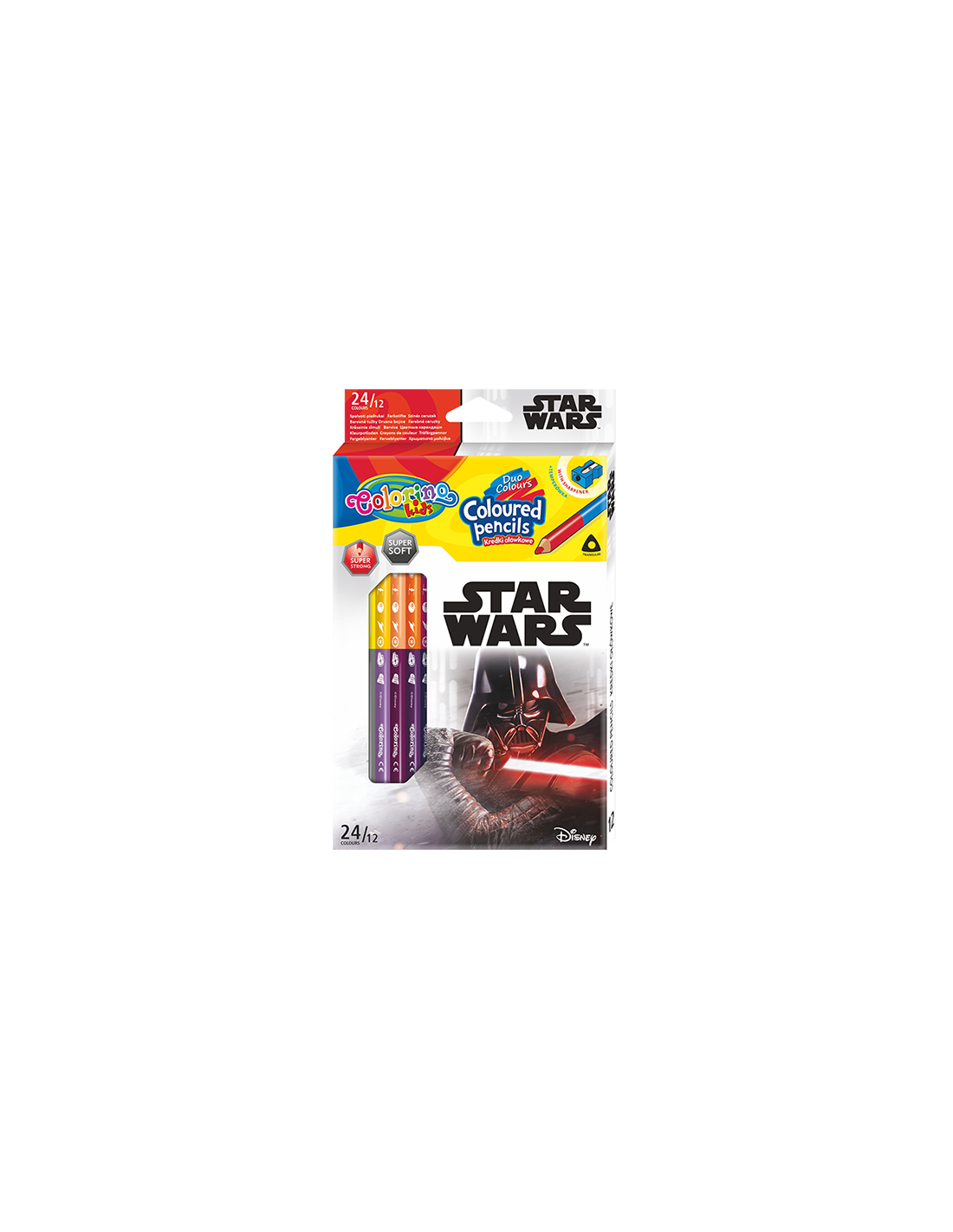 Školní pastelky Colorino mají ergonometrický, trojúhelníkový tvar, který zajišťuje u dětí správný úchop při kreslení. Každá pastelka má však odlišně zbarvený konec, opatřený jinak barevnou tuhou. Díky tomuto systému získáte celkem 24 unikátních barev ve 12 kusech pastelek. Pastelky jsou málo lámavé, tuha je do dřeva po celé délce vlepená. Pastelky jsou vhodné pro kluky i holky, motiv na papírové krabičce v podobě Star Wars, je však bližší chlapcům. Barvy jsou velmi syté, tuha silně pigmentovaná, není rozmývatelná vodou.