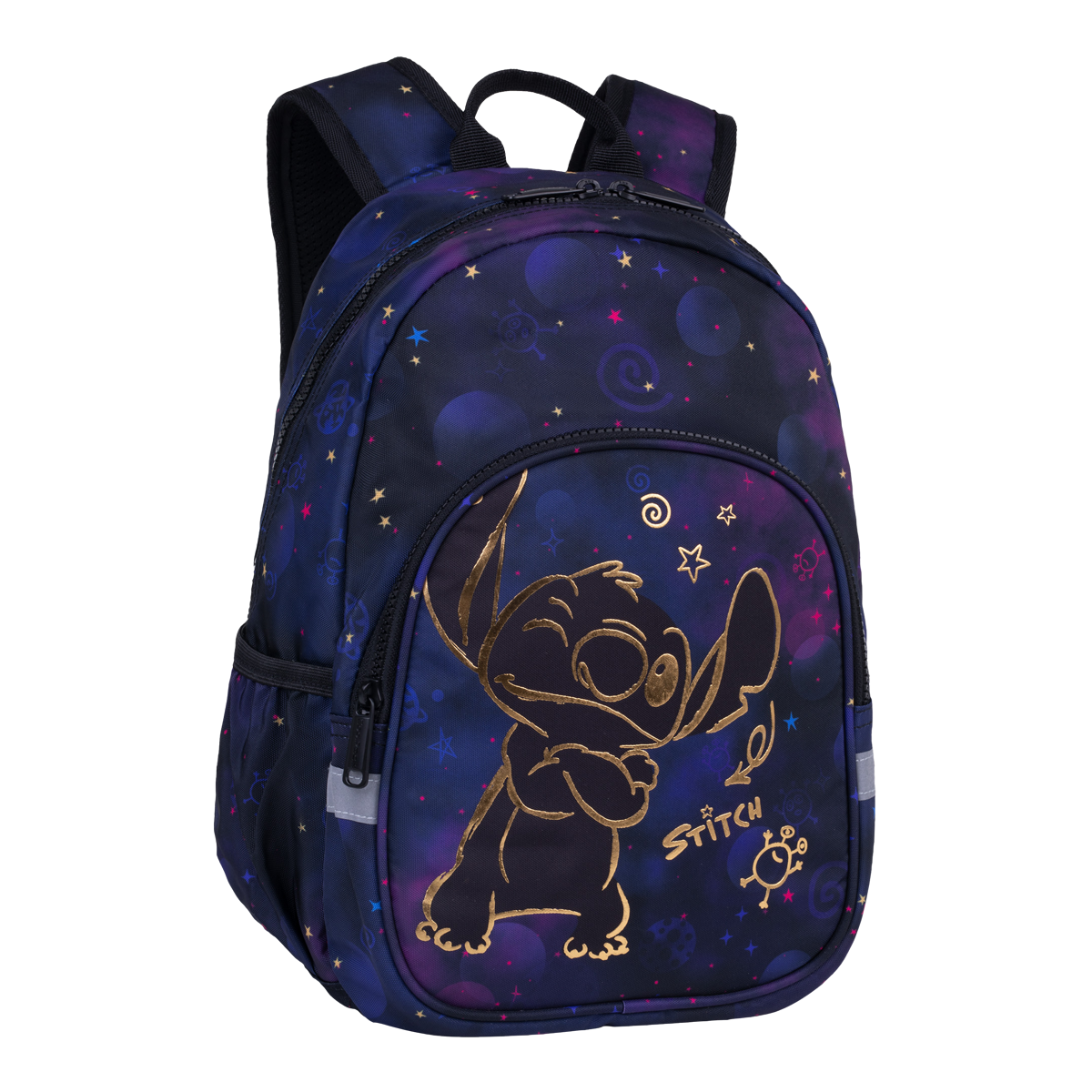 Lehký dětský batůžek s motivem roztomilého Sitche. Hlavní kapsa s kontrastními zipy poskytuje dostatek prostoru pro všechny nezbytnosti dítěte. Polohovací ramenní popruhy jsou opatřeny upínací přezkou přes hrudník a integrovanou bezpečnostní píšťalkou. Dvě boční otevřené kapsy jsou vhodné pro láhev s vodou nebo na jiné drobné nezbytnosti.rozměry: š: 25 × v: 34 × h: 11 cmvelikost: 9 lmateriál: 100 % polyester2 kapsy na zip, 2 menší otevřené kapsyvoděodolný, reflexní prvkypoutko na zavěšení, polstrovaná zádakombinovatelný s kolekcí Stitch Goldobsah balení: 1 ks
