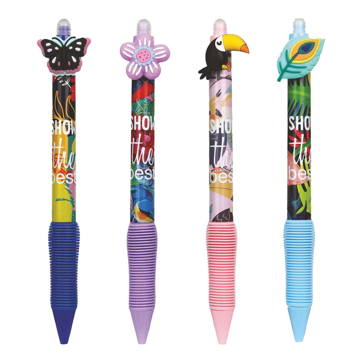 Kolekce gumovatelných per s barevným tělem a roztomilými motivy z divoké džungle. Příjemný pogumovaný grip zajistí pohodlný úchop každému školákovi.šířka stopy: 0,5 mmbarva náplně: modrá stiskací mechanika v klipudostupná náhradní náplň: 0,5 mm R37534PTR; 0,7 mm R34689000064 barevné motivypogumovaný gripobsah balení: 36 ks /displej