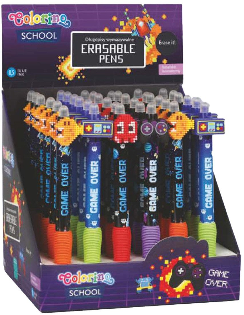 Kolekce gumovatelných per s barevným tělem a roztomilými motivy počítačových her. Příjemný pogumovaný grip zajistí pohodlný úchop každému školákovi. • šířka stopy: 0,5 mm • barva náplně: modrá • stiskací mechanika v klipu • 4 motivy počítačových her • pogumovaný grip