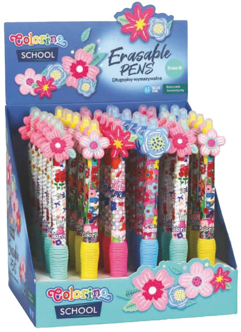 Kolekce gumovatelných per s barevným tělem a roztomilou ozdobou květin. Příjemný pogumovaný grip zajistí pohodlný úchop každému školákovi. • šířka stopy: 0,5 mm • barva náplně: modrá • stiskací mechanika v klipu • 4 motivy květin • pogumovaný grip