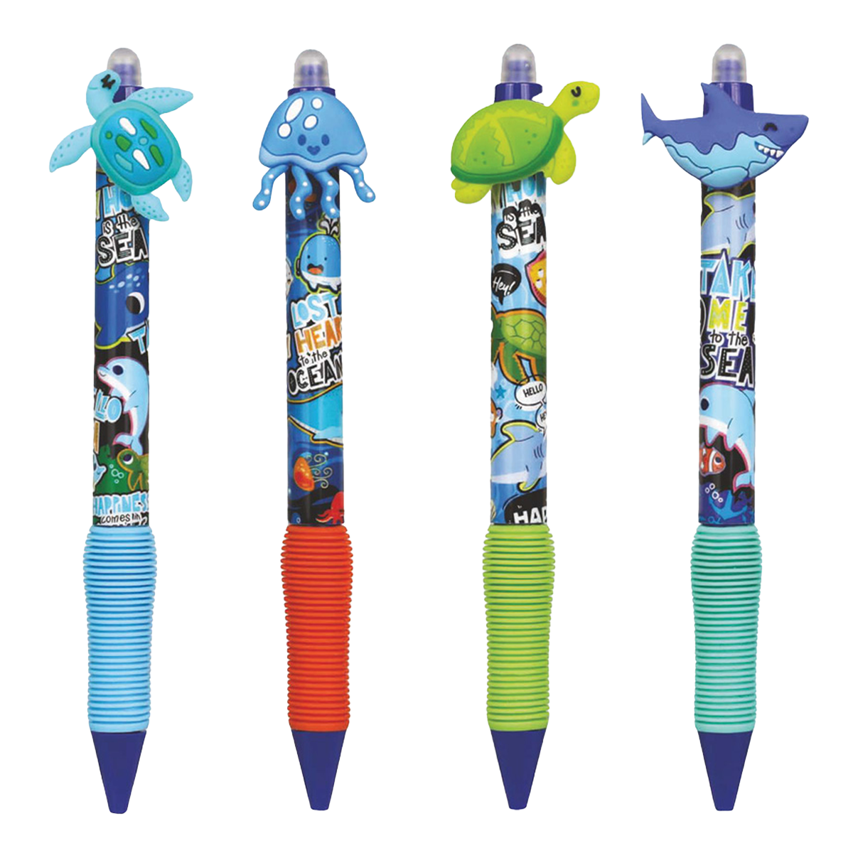 Kolekce gumovatelných per s barevným tělem a roztomilými motivy mořských zvířátek. Příjemný pogumovaný grip zajistí pohodlný úchop každému školákovi.šířka stopy: 0,5 mmbarva náplně: modrá stiskací mechanika v klipudostupná náhradní náplň: 0,5 mm R37534PTR; 0,7 mm R34689000064 motivy mořského světapogumovaný gripobsah balení: 36 ks /displej