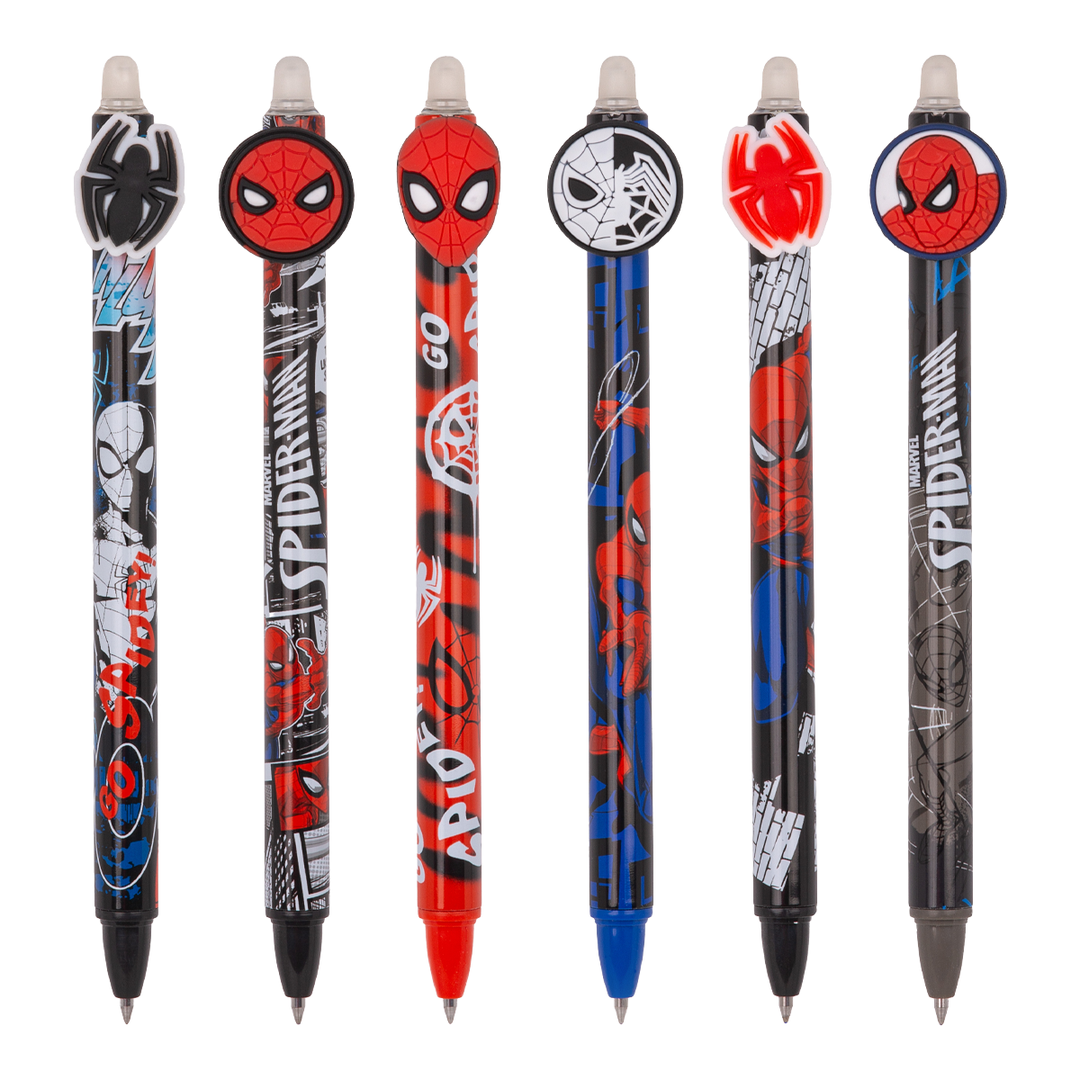 Kolekce gumovatelných per s motivy pavoučího hrdiny z dílny Marvel.šířka stopy: 0,5 mmbarva náplně: modrá stiskací mechanika v klipudostupná náhradní náplň: 0,5 mm R37534PTR; 0,7 mm R34689000066 motivůobsah balení: 36 ks /displej