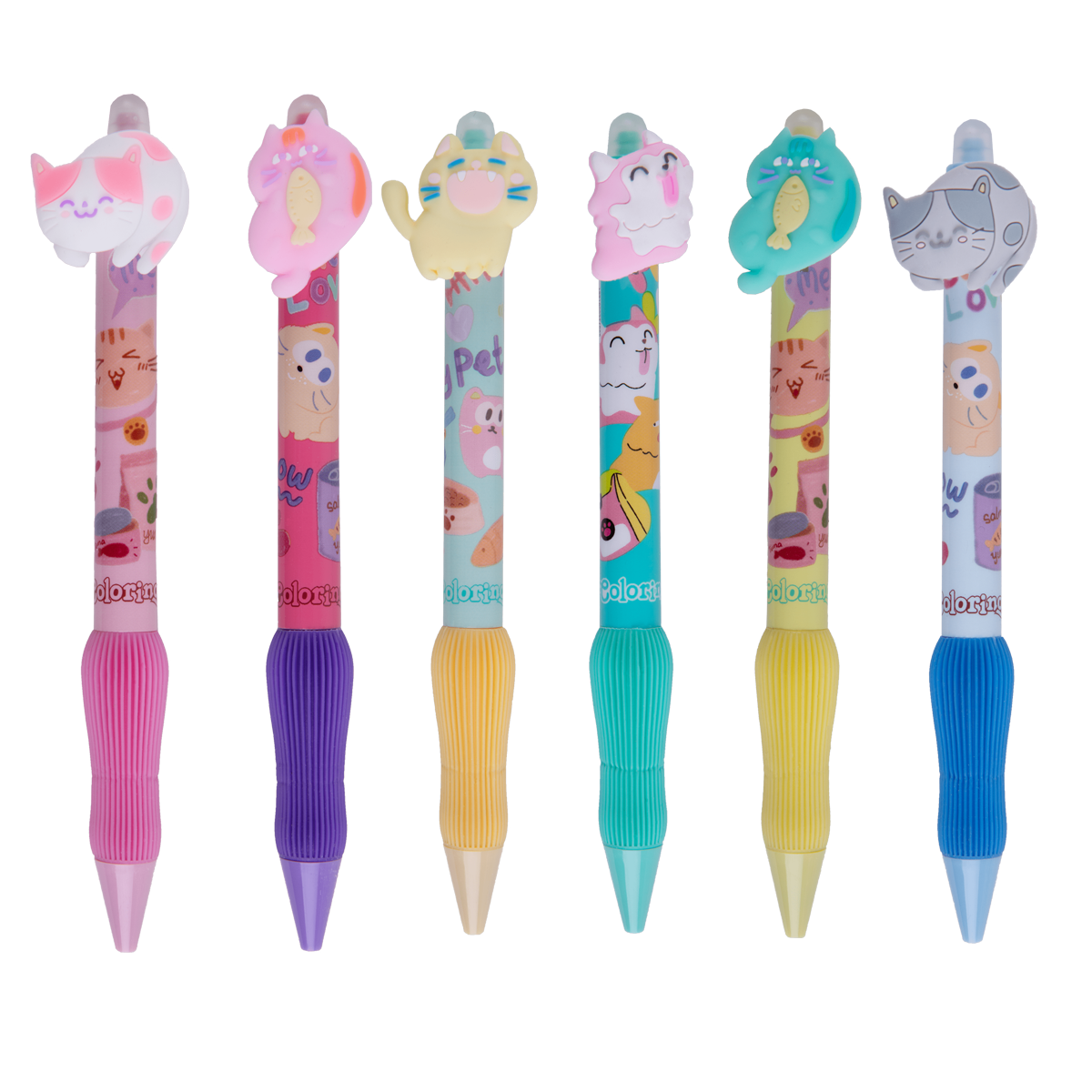 Veselá gumovatelná pera, které zaženou nudu v každé školní lavici. Roztoč kočku a sleduj kolikrát se otočí dokola. Barevně sladěné tělo a na dotek příjemný pogumovaný grip, zaručí pohodlné a radostné psaní.šířka stopy: 0,5 mmbarva náplně: modrástiskací mechanika s rotující kočkoudostupná náhradní náplň: 0,5 mm R37534PTR; 0,7 mm R34689000066 motivůobsah balení: 36 ks/displej