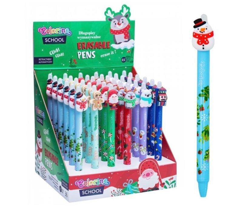 Praktická gumovatelná pera pro děti s vánočními motivy. Kvalitní inkoust lze v případě potřeby jednoduše vygumovat a přepsat.Náplň modrá. Mix motivů bez možnosti výběru.