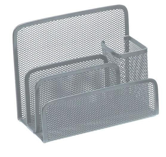 Kovový organizér na dopisy a psací potřeby ve stříbrné barvě. Rozměry: šířka 17cm, výška 13,5cm, hloubka 8,3cm.