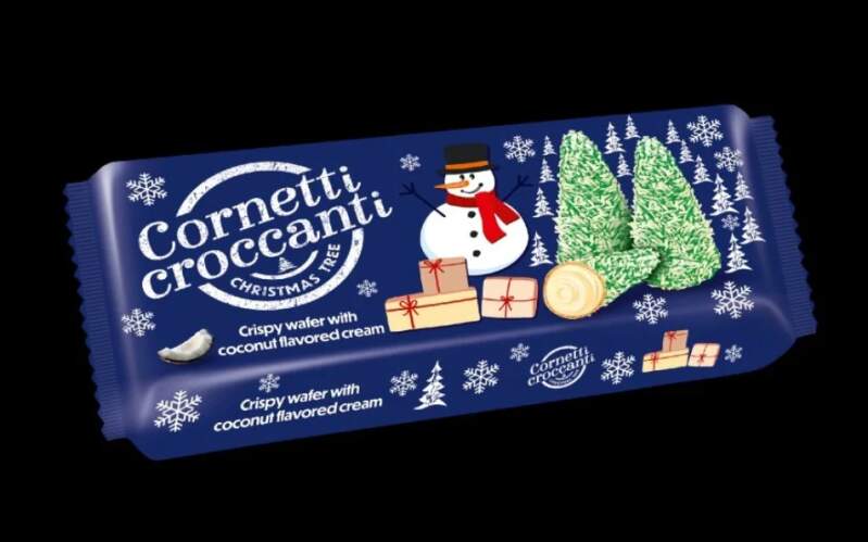 Máčená oplatka plněná kokosovým krémem ve tvaru stromečků Složení: krém s kokosovou příchutí 63 % (cukr, rostlinný olej (řepkový, slunečnicový), sušenásyrovátka (MLÉČNÁ),plně hydrogenovaný rostlinný olej (palmový, řepkový), kokosové vločky 0,7%, kakaový prášek se sníženýmobsahem tuku, LÍSKOVÉ OŘECHY 1%, emulgátory: tristearát sorbitolu, SÓJOVÝ lecitin; aroma) poleva 25 % (cukr, plně hydrogenovaný rostlinný olej (palmový, řepkový), sušená syrovátka (MLÉČNÁ), emulgátory: tristearát sorbitolu, SÓJOVÝ lecitin; aroma, barvivo E141 oplatka 7%(PŠENIČNÁ MOUKA, rostlinný olej (řepkový), cukr, sůl, kypřící látky: uhličitany sodný), kokosové vločky 5% Výrobek může obsahovat : JINÉ OŘECHY, SEZAMOVÁ SEMÍNKA, VEJCE, OXIDSIŘIČITÝ a SIŘIČITANY. Výživové údaje na 100 g energetická hodnota 2361 kj / 566 kcal tuky 35 g z toho nasycených 12 g sacharidy 60g z toho cukry 49 g bílkoviny 1,7 g sůl 0,28 g