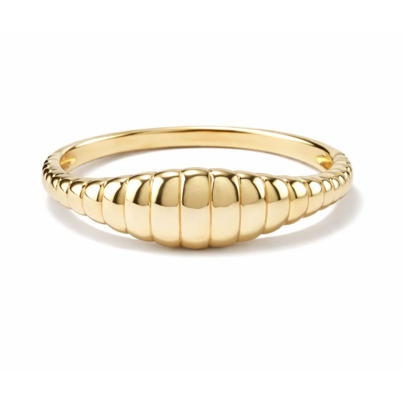 Výrazný croissant prsten zaujme na první pohled svým ikonickým tvarem inspirovaným francouzským pečivem. Jeho zaoblený, plastický design s jemným žebrováním působí luxusně, moderně a zároveň nadčasově. Tento typ šperku se stal symbolem sebevědomého stylu a ženské elegance.Prsten je vyroben z kvalitní chirurgické oceli, která je známá svou odolností a dlouhou životností. Je hypoalergenní, šetrný k pokožce a vhodný pro každodenní nošení bez obav. Díky své odolnosti si zachovává krásný vzhled i při kontaktu s vodou.Zlatý lesk prstenu krásně odráží světlo a dodává mu exkluzivní vzhled, který vynikne jak při denním nošení, tak při výjimečných příležitostech. Croissant prsten je ideální volbou pro ženy, které hledají výrazný, ale zároveň praktický šperk. 💡 Tip: Díky odolnému materiálu můžete prsten bez obav nosit i při běžných denních aktivitách, včetně mytí rukou.
