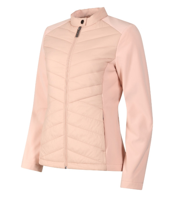 kombinace prošívaného a softshellového materiálu střih tvarovaný bočními díly stojáček na druk celopropínací spirálový zip boční kapsy se spirálovým zipem vnitřní náprsní kapsa na zip vstup pro branding v podšívce zadního dílu