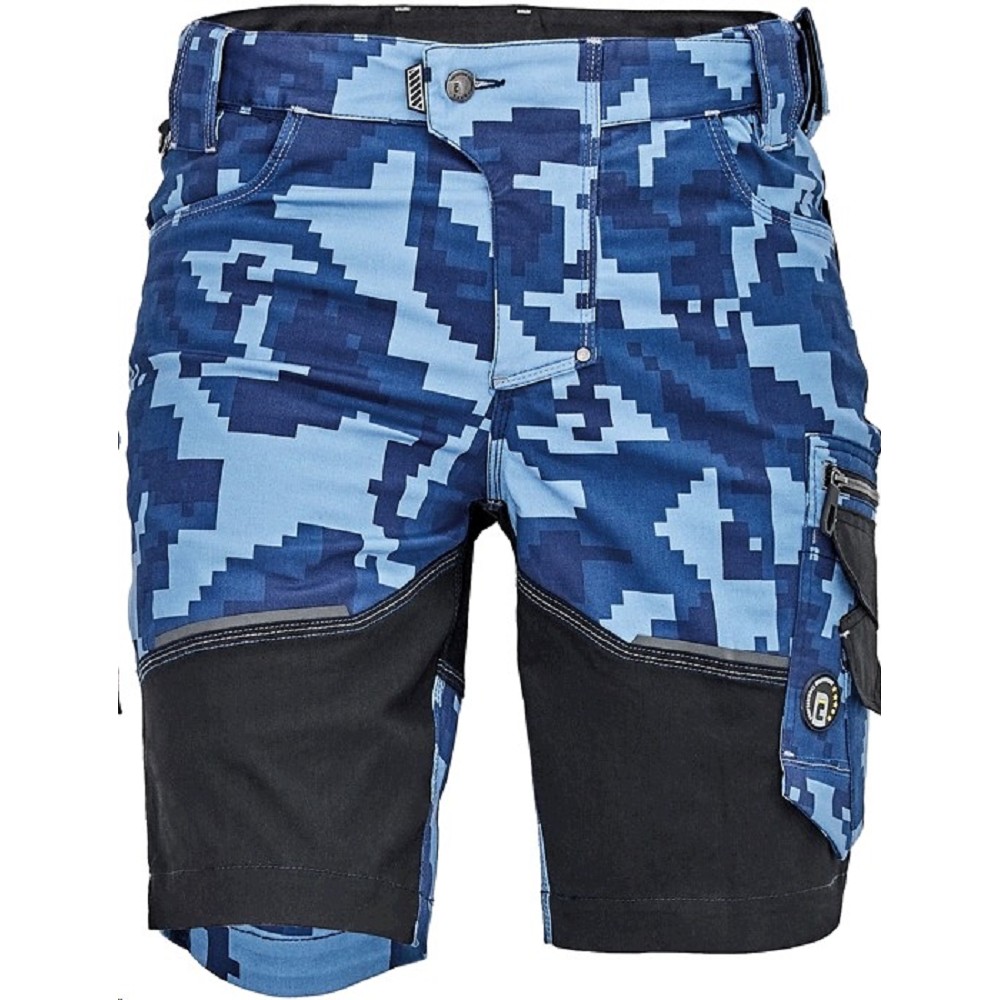 Montérkové kraťasy NEURUM CAMOUFLAGE navy 62% bavlna 35% polyester 3% elestan - pánské pracovní šortky - elastický inovativní materiál TRIFIBETEX® v přírodním maskování - ergonomický střih, snížený pružný pas - odolné trojité prošití nohavic a sedu, prostorné multifunkční přední kapsy s poutky na nářadí - 2 zadní kapsy na suchý zip, stehenní kapsa na telefon s klopou a zapínáním na suchý zip, kapsa na metr a nůž, poutko na kladivo - "D" kroužek, poutko na nářadí v pase - originální zpracování zapínání kalhot, reflektivní prvky v barevném odstínu. - Barva : navy CAMOUFLAGE - Velikosti : 46-64 - Matriál: Trifibetex s geometrickými vzory - 62% bavlna, 35% polyester, 3% elestan, 260g/m2