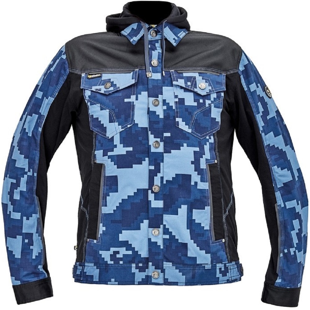 Montérková bunda NEURUM CAMOUFLAGE pánská modro-černá Pánská pracovní bunda se stojacím límcem, zapínáním na druky a odepínací kapucí, elastický inovativní materiál TRIFIBETEX® v přírodním maskování, ergonomický střih, zesílená oblast ramen z materiálu CORDURA, 2 boční kapsy, 2 náprsní kapsy na druky, reflektivní prvky v barevném odstínu. Velikosti 46 | 48 | 50 | 52 | 54 | 56 | 58 | 60 | 62 | 64 Materiál: 20 % TRIFIBETEX PRO 80 % TRIFIBETEX