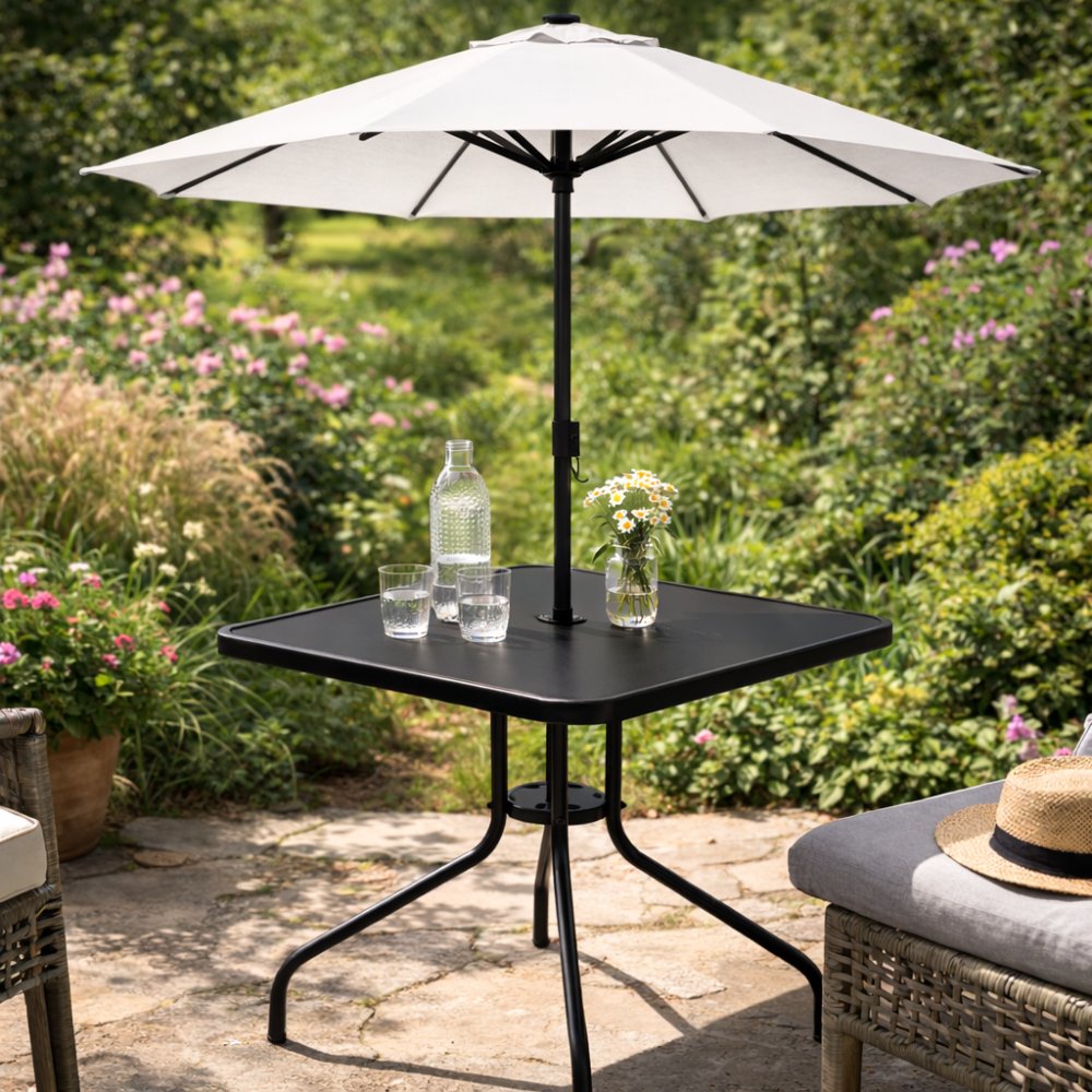 Prostorný skleněný zahradní stůl je ideálním řešením pro pohodlné posezení na terase, balkonu nebo na zahradě. Čtvercová deska nabízí dostatek prostoru na nápoje, občerstvení nebo letní stolování s rodinou a přáteli. Deska je vyrobena z tvrzeného skla, které je odolné jak vůči mechanickému poškození, tak vůči povětrnostním vlivům. Hladký povrch se snadno udržuje a černý ochranný rám zpevňuje hrany, čímž zvyšuje odolnost celé konstrukce. Stabilitu zajišťuje pevná ocelová základna s práškovým nástřikem, která chrání stůl před korozí a vlhkostí. Dva výztužné spojovací prvky dodávají pevnost a protiskluzové nožičky chrání podlahu před poškrábáním. Velkou výhodou je praktický otvor pro slunečník o průměru 4,5 cm, který usnadňuje montáž zahradního slunečníku přímo do středu stolu. Pokud slunečník nepoužíváte, můžete otvor esteticky zakrýt přiloženým krytem. Maximální nosnost 60 kg zaručuje bezpečné a stabilní používání po celou sezónu. Tento čtvercový zahradní stůl se sklem a otvorem pro slunečník je funkčním a estetickým doplňkem každého exteriéru. Specifikace: Typ: zahradní stůl Tvar: čtverec Rozměr vrchní desky: 80 x 80 cm Materiál talíře: tvrzené sklo Barva rámu: černá Konstrukční materiál: ocel s práškovým nástřikem Maximální nosnost: 60 kg Protiskluzové nožičky: ano Odolné vůči povětrnostním vlivům: ano Otvor pro slunečník: ano Průměr otvoru: 4,5 cm Deštník není součástí balení.