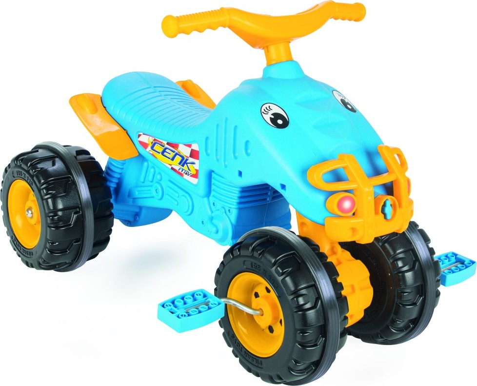 Čtyrkolka šlapací ATV v modré barvě. Čtyřkolka má pružnou přední nápravu, pedály, blatníky. Maximální nosnost 35 kg.