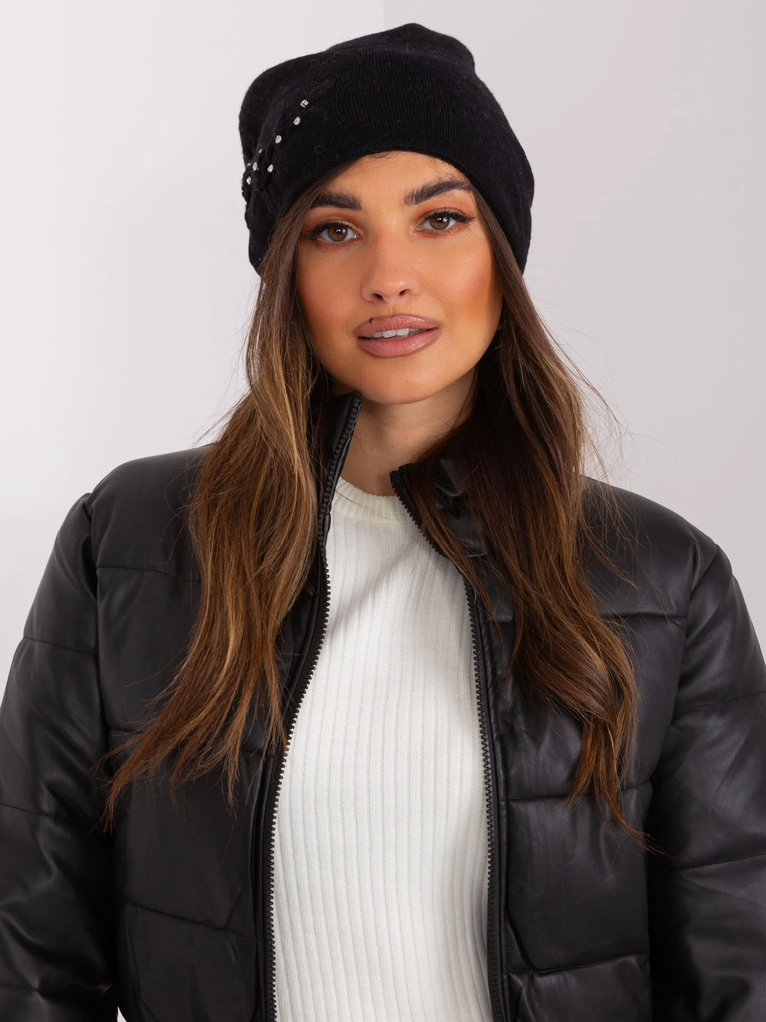 Černá čepice z hladkého úpletu s aplikacemi. kód produktu: AT-CZ-2329.76 dominantní design: nášivka