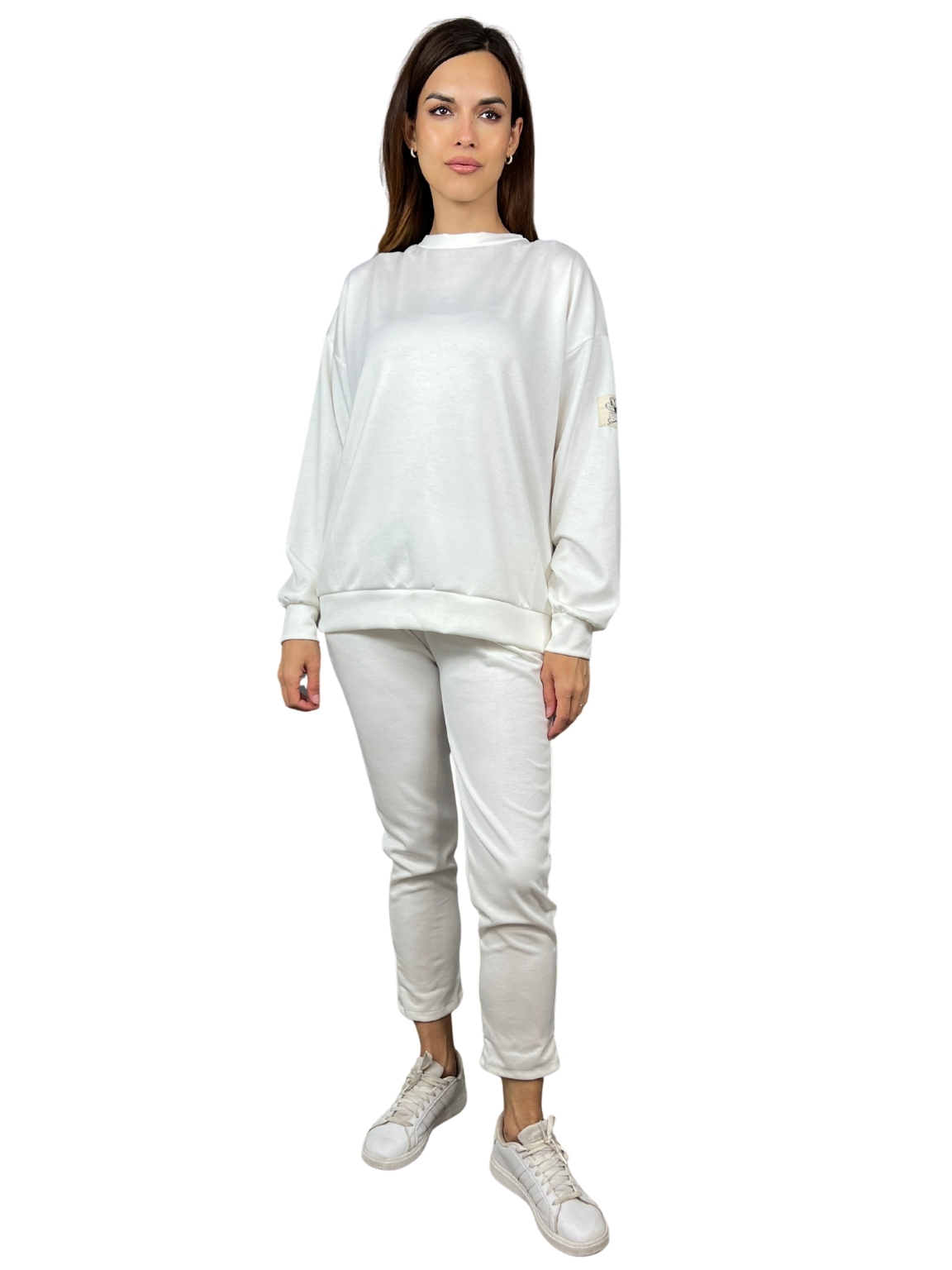 Mikina má uvolněný střih s kulatým výstřihem a spadlými rameny. Kalhoty mají elastický pas a rovné nohavice končící nad kotníky. Dohromady tvoří vyvážený komplet, který je snadno kombinovatelný a dobře drží tvar.
