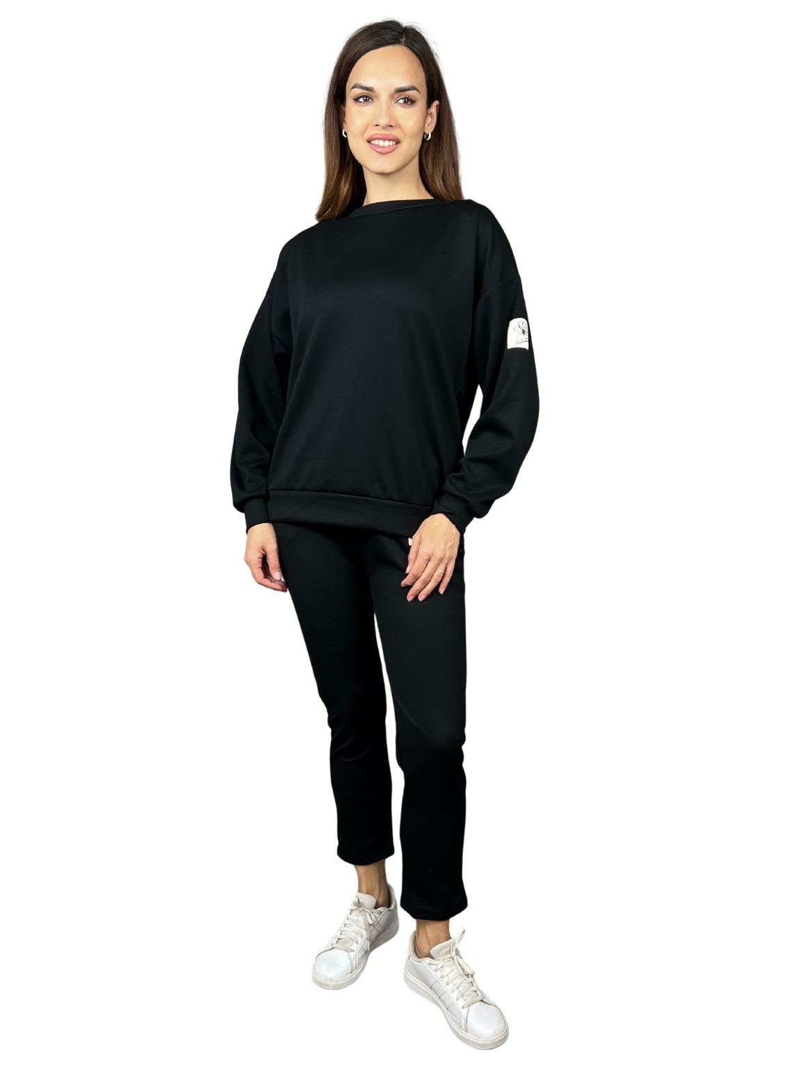 Mikina má uvolněný střih s kulatým výstřihem a spadlými rameny. Kalhoty mají elastický pas a rovné nohavice končící nad kotníky. Dohromady tvoří vyvážený komplet, který je snadno kombinovatelný a dobře drží tvar.