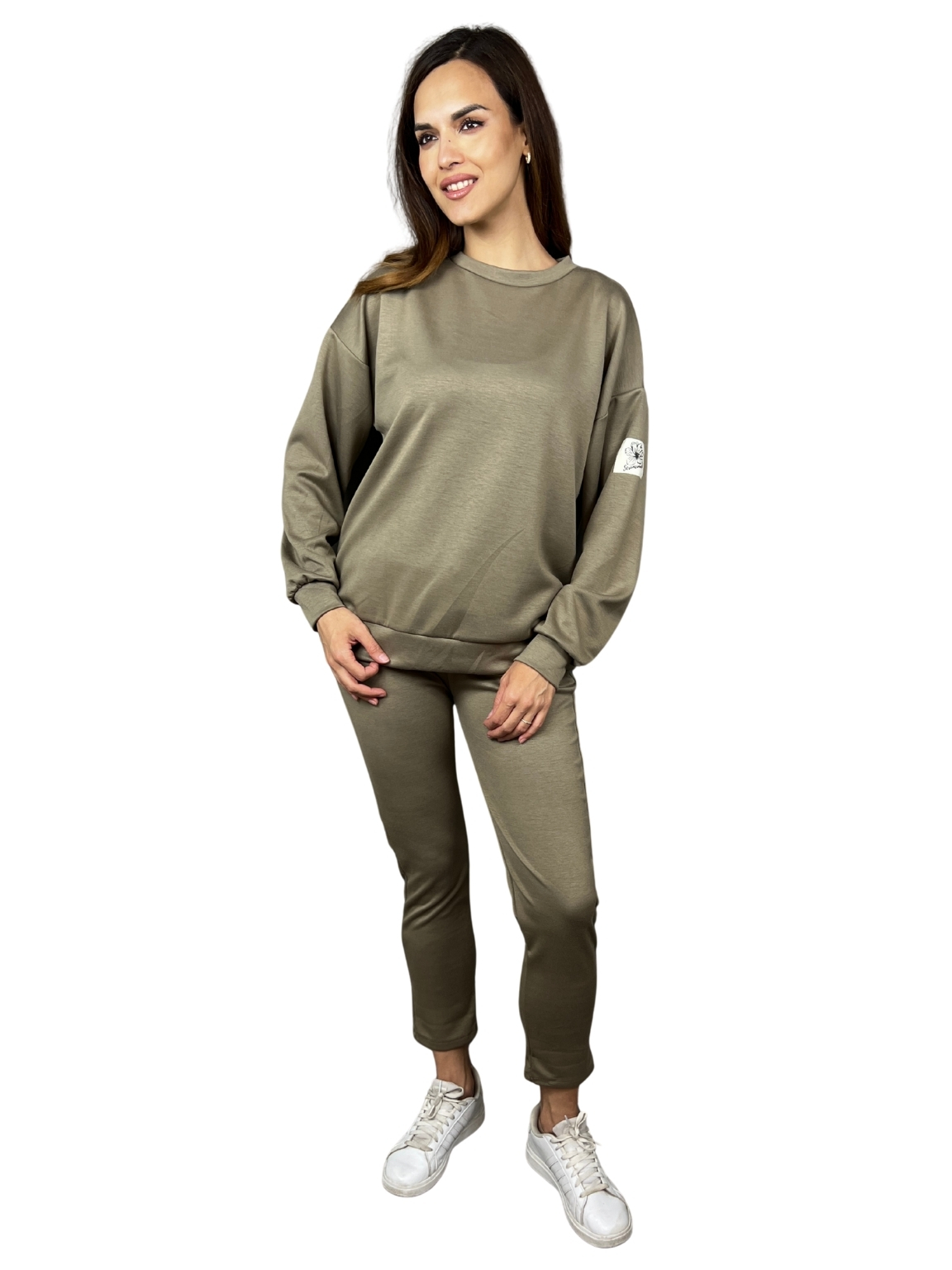 Mikina má uvolněný střih s kulatým výstřihem a spadlými rameny. Kalhoty mají elastický pas a rovné nohavice končící nad kotníky. Dohromady tvoří vyvážený komplet, který je snadno kombinovatelný a dobře drží tvar.