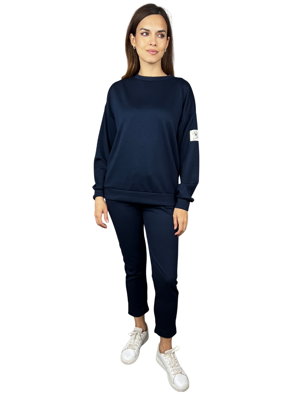 Mikina má uvolněný střih s kulatým výstřihem a spadlými rameny. Kalhoty mají elastický pas a rovné nohavice končící nad kotníky. Dohromady tvoří vyvážený komplet, který je snadno kombinovatelný a dobře drží tvar.