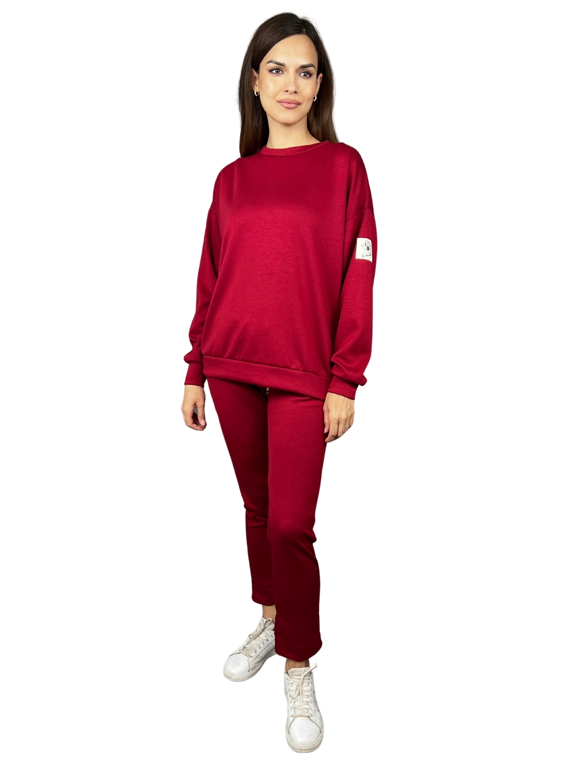 Mikina má uvolněný střih s kulatým výstřihem a spadlými rameny. Kalhoty mají elastický pas a rovné nohavice končící nad kotníky. Dohromady tvoří vyvážený komplet, který je snadno kombinovatelný a dobře drží tvar.