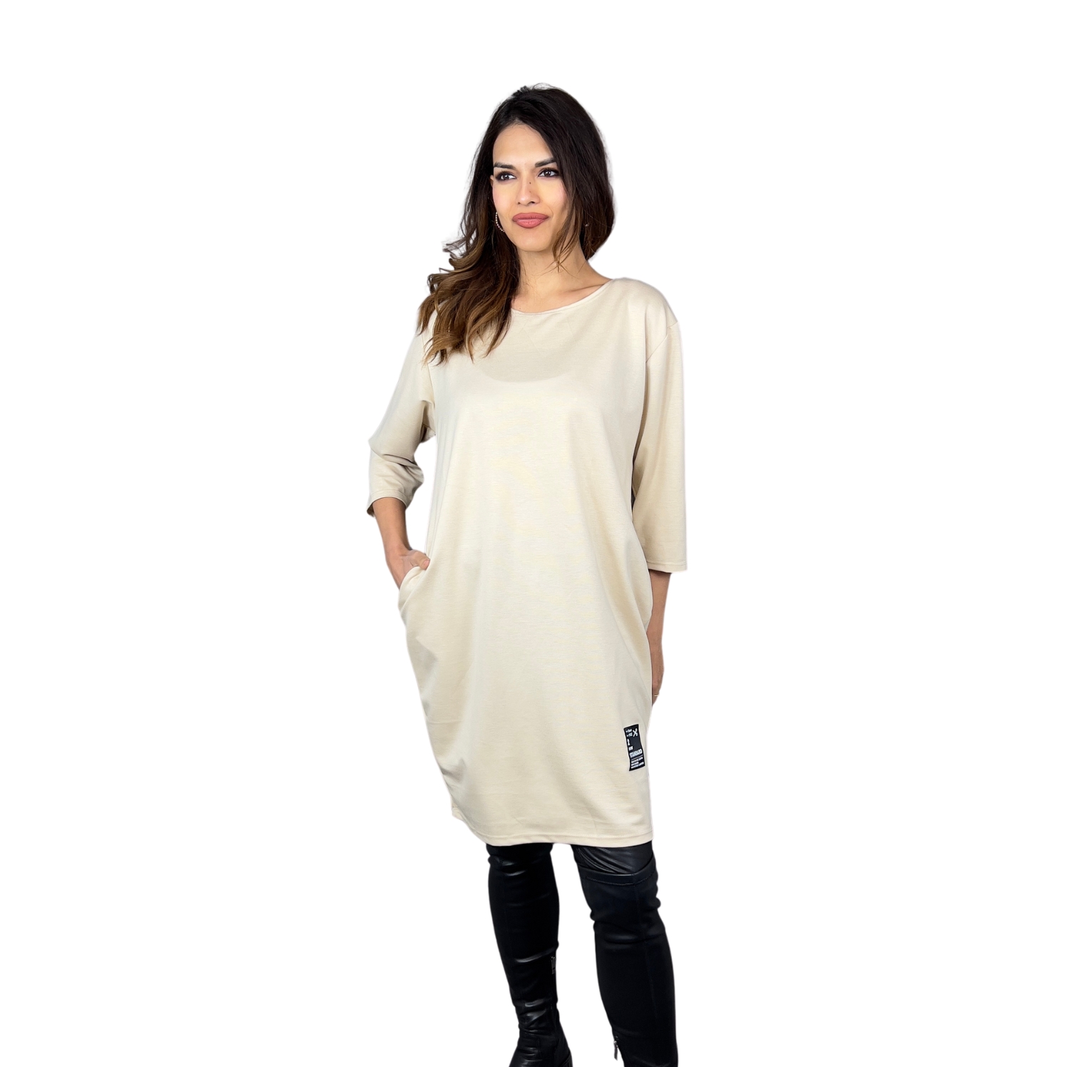 Dámské šaty Caspia jsou skvělou volbou pro ženy, které hledají styl a pohodlí v jednom. Volnější střih s mírně balónovým efektem zajišťuje komfort a lichotivě sedí na různých typech postavy. Tříčtvrteční rukávy a kulatý výstřih dodávají minimalistický a moderní vzhled, zatímco praktické boční kapsy a stylová nášivka na spodním lemu dodávají šatům originální akcent.