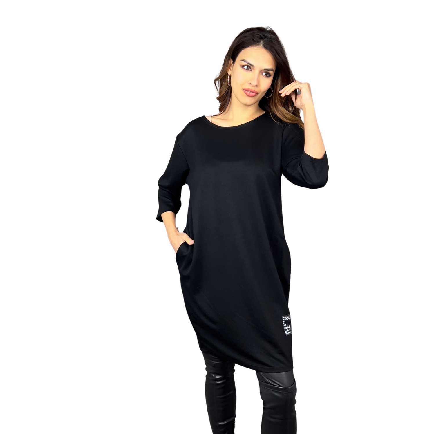 Dámské šaty Caspia jsou skvělou volbou pro ženy, které hledají styl a pohodlí v jednom. Volnější střih s mírně balónovým efektem zajišťuje komfort a lichotivě sedí na různých typech postavy. Tříčtvrteční rukávy a kulatý výstřih dodávají minimalistický a moderní vzhled, zatímco praktické boční kapsy a stylová nášivka na spodním lemu dodávají šatům originální akcent.