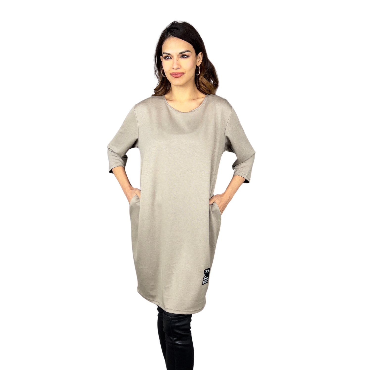Dámské šaty Caspia jsou skvělou volbou pro ženy, které hledají styl a pohodlí v jednom. Volnější střih s mírně balónovým efektem zajišťuje komfort a lichotivě sedí na různých typech postavy. Tříčtvrteční rukávy a kulatý výstřih dodávají minimalistický a moderní vzhled, zatímco praktické boční kapsy a stylová nášivka na spodním lemu dodávají šatům originální akcent.