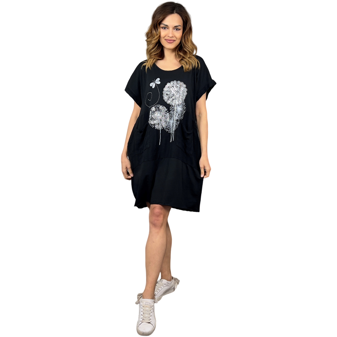 Stylové dámské letní šaty Sora s kapsami. Jsou v jednobarevném provedení s květinovým potiskem. Šaty jsou volnějšího střihu a velikosti 3XL+ - viz tabulka velikostí. Mají příjemný bavlněný a lněný materiál.