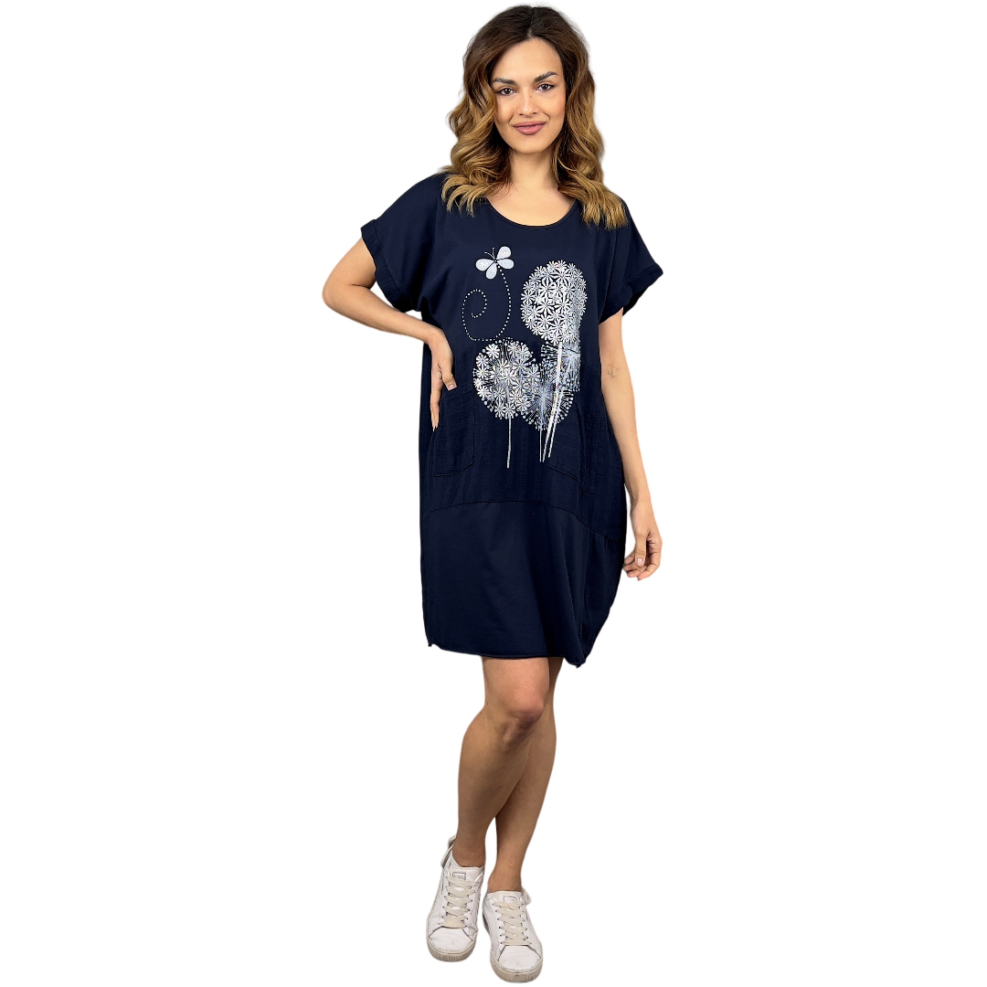 Stylové dámské letní šaty Sora s kapsami. Jsou v jednobarevném provedení s květinovým potiskem. Šaty jsou volnějšího střihu a velikosti 3XL+ - viz tabulka velikostí. Mají příjemný bavlněný a lněný materiál.