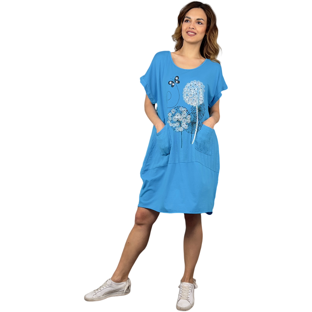 Stylové dámské letní šaty Sora s kapsami. Jsou v jednobarevném provedení s květinovým potiskem. Šaty jsou volnějšího střihu a velikosti 3XL+ - viz tabulka velikostí. Mají příjemný bavlněný a lněný materiál.