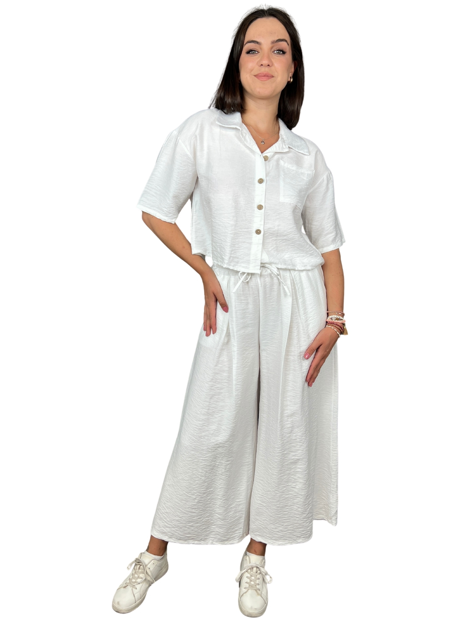Noste komplet společně nebo odděleně – košili můžeš kombinovat s džínami či sukní, kalhoty zase s crop topem nebo basic tílkem. Skvělý na víkendový výlet, nákupy i pohodové dny ve městě.