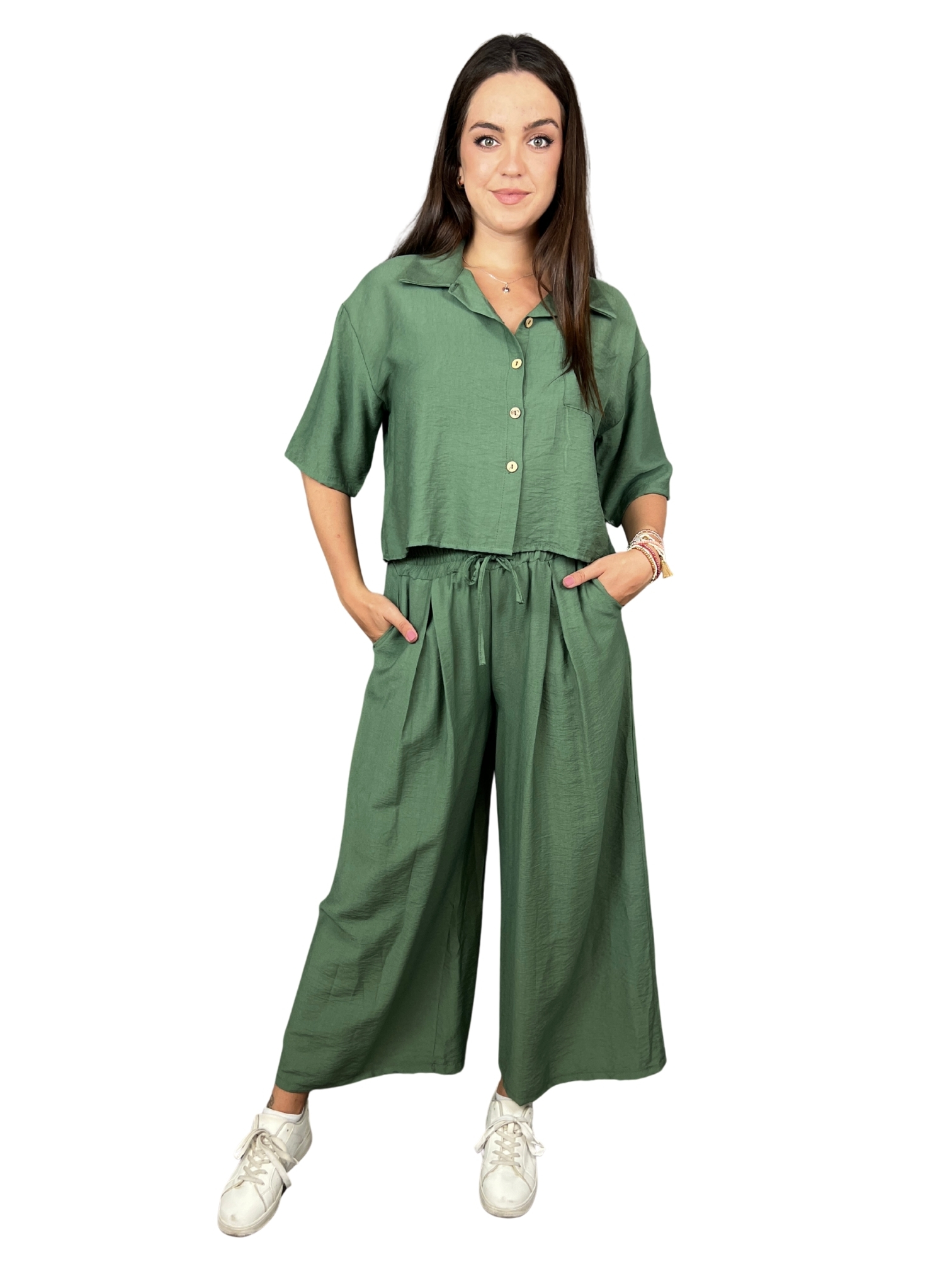 Noste komplet společně nebo odděleně – košili můžeš kombinovat s džínami či sukní, kalhoty zase s crop topem nebo basic tílkem. Skvělý na víkendový výlet, nákupy i pohodové dny ve městě.
