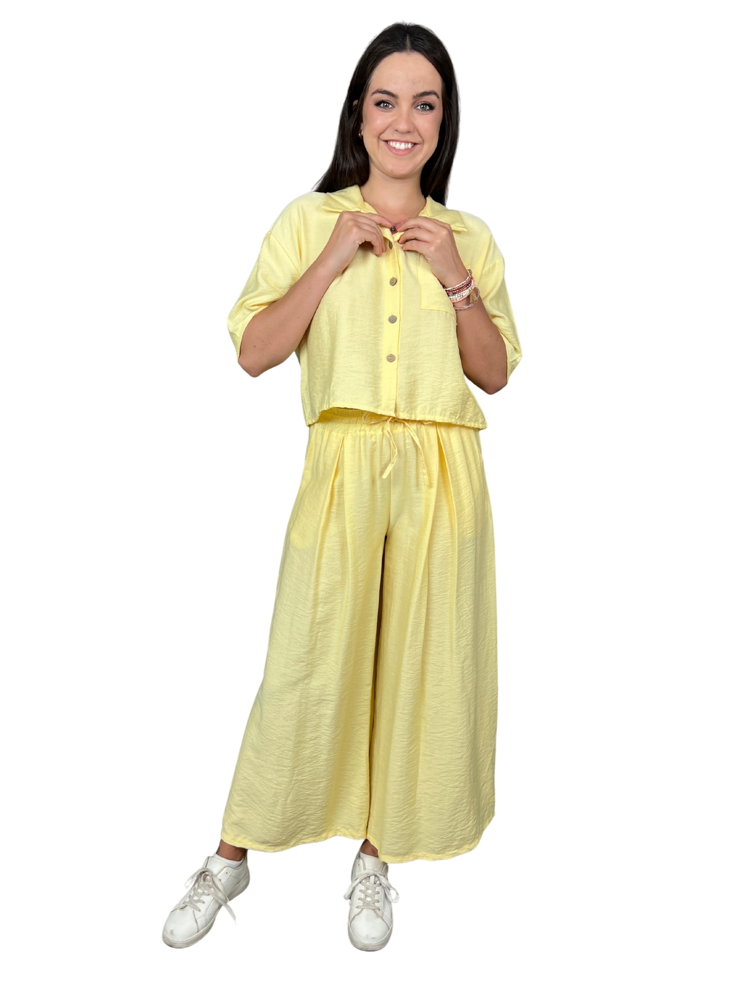 Noste komplet společně nebo odděleně – košili můžeš kombinovat s džínami či sukní, kalhoty zase s crop topem nebo basic tílkem. Skvělý na víkendový výlet, nákupy i pohodové dny ve městě.