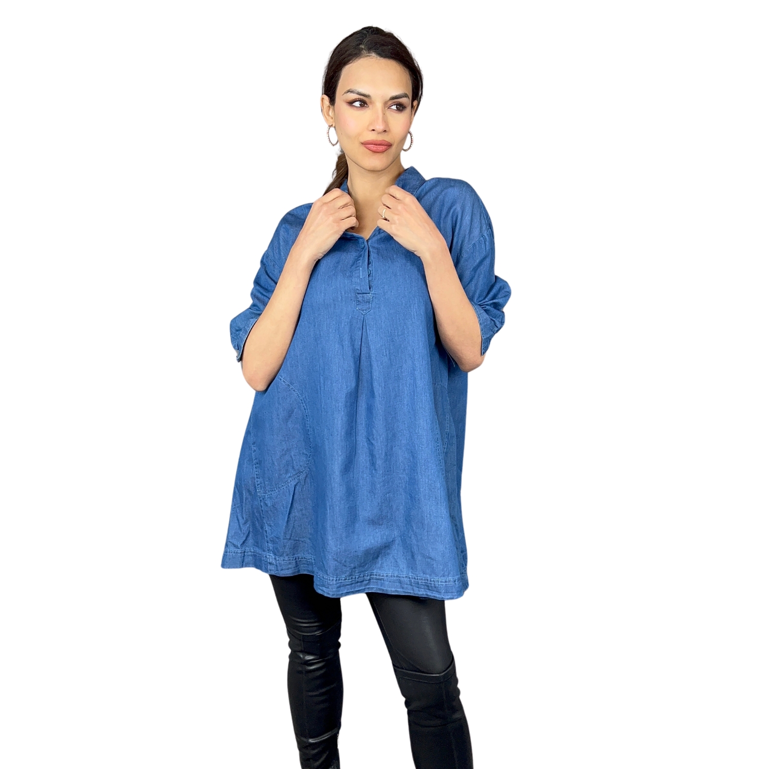 Halenka je vybavena límečkem a zapínáním na knoflíky, které jí dodávají sofistikovaný vzhled. Tříčtvrteční rukávy jsou ideální pro jarní i podzimní období, a praktické kapsy zvyšují její funkčnost. Díky rozšířenému střihu poskytuje volnost pohybu a je ideální volbou pro celodenní nošení.
