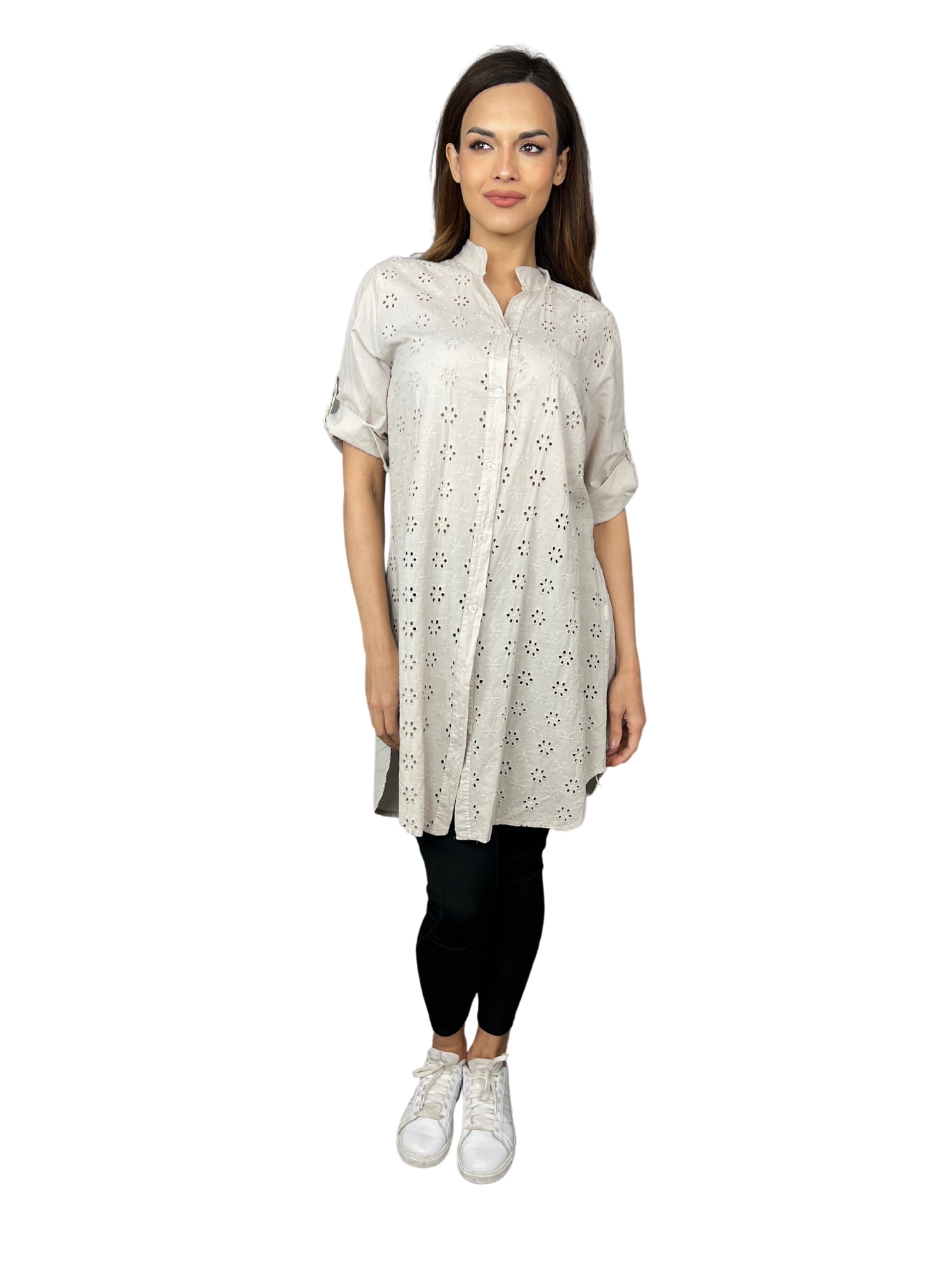 Přední část je zdobena celoplošnou ažurovou výšivkou v květinovém motivu. Rukávy lze elegantně ohrnout a zapnout na knoflík – stylový i praktický detail. Košile má zapínání po celé délce na knoflíky a decentní stojáček, který podtrhuje její sofistikovaný vzhled.