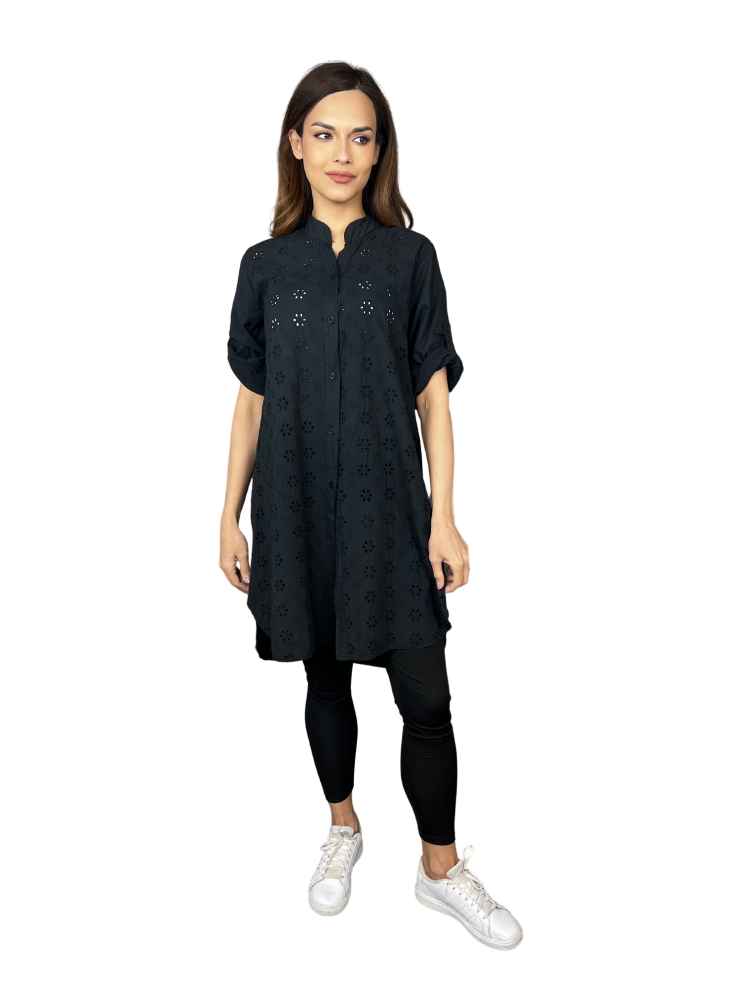 Přední část je zdobena celoplošnou ažurovou výšivkou v květinovém motivu. Rukávy lze elegantně ohrnout a zapnout na knoflík – stylový i praktický detail. Košile má zapínání po celé délce na knoflíky a decentní stojáček, který podtrhuje její sofistikovaný vzhled.