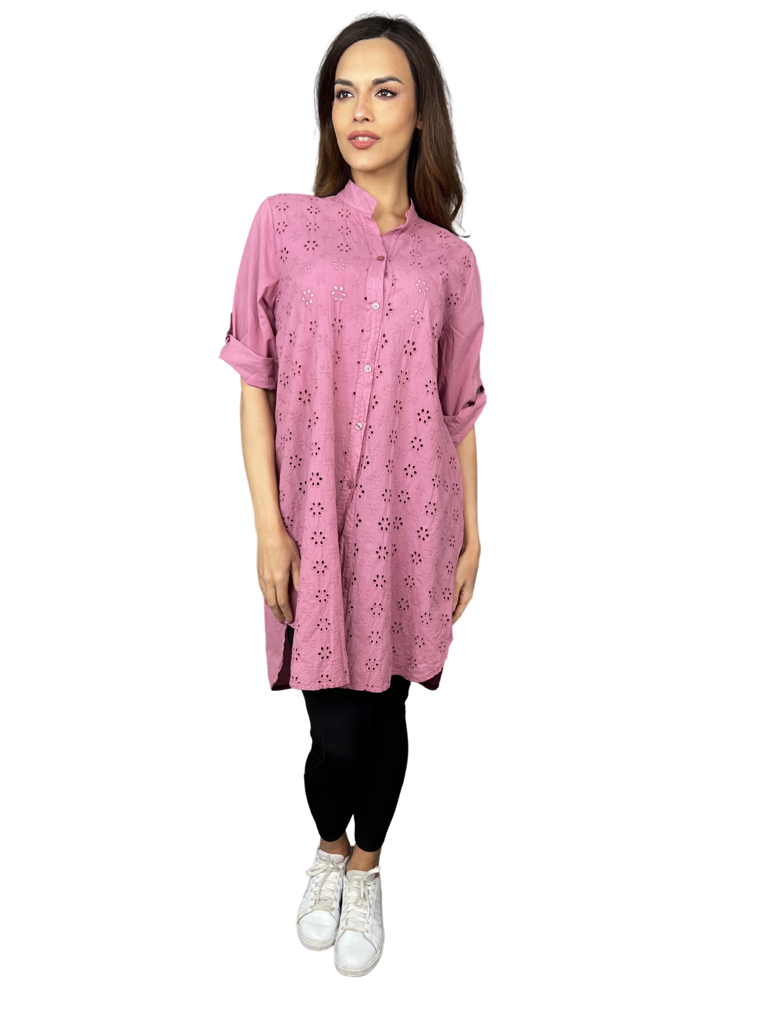 Přední část je zdobena celoplošnou ažurovou výšivkou v květinovém motivu. Rukávy lze elegantně ohrnout a zapnout na knoflík – stylový i praktický detail. Košile má zapínání po celé délce na knoflíky a decentní stojáček, který podtrhuje její sofistikovaný vzhled.