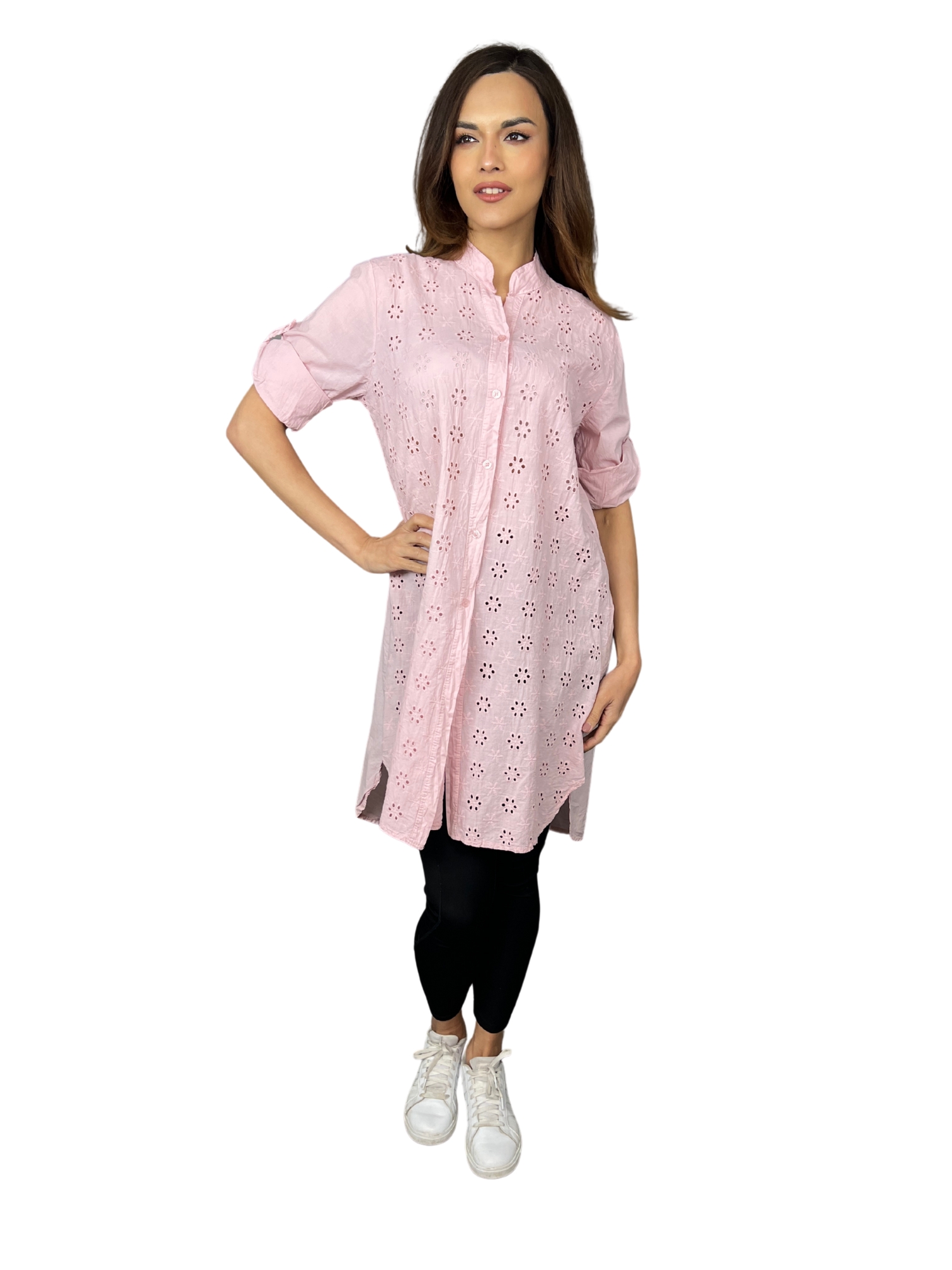Přední část je zdobena celoplošnou ažurovou výšivkou v květinovém motivu. Rukávy lze elegantně ohrnout a zapnout na knoflík – stylový i praktický detail. Košile má zapínání po celé délce na knoflíky a decentní stojáček, který podtrhuje její sofistikovaný vzhled.