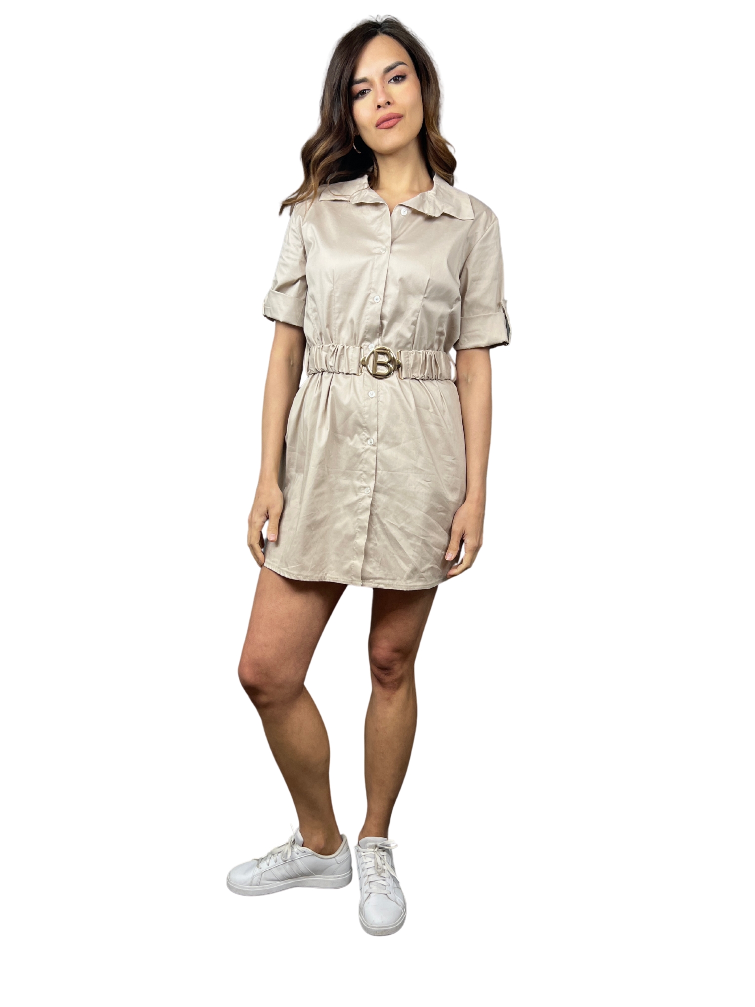 Šaty mají přední zapínání na knoflíky a ozdobný elastický pásek se zlatou přezkou s písmenem „B“, který vytváří ženskou siluetu. Krátké rukávy lze snadno ohrnout a připnout pomocí knoflíkového poutka. Díky své délce do půli stehen působí svěže a mladistvě, zároveň ale decentně.