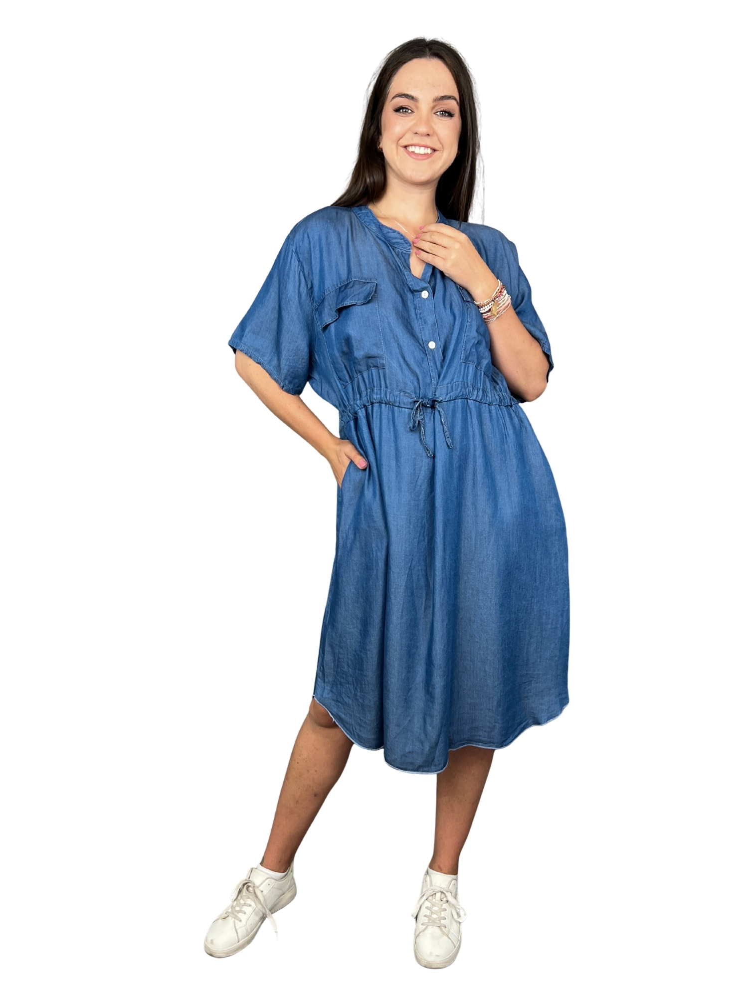 Džínový vzhled šatů dodává ležérní nádech, který skvěle vynikne v kombinaci s bílými teniskami, espadrilkami nebo sandálky. Délka ke kolenům a kapsy z nich dělají praktický a stylový kousek nejen do města.