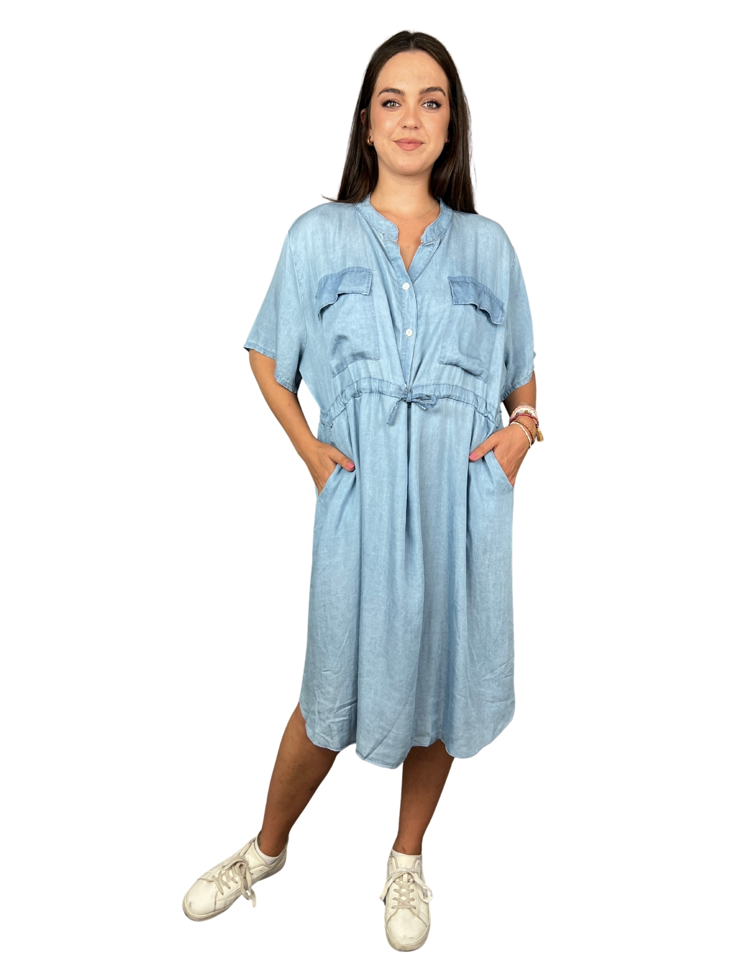 Džínový vzhled šatů dodává ležérní nádech, který skvěle vynikne v kombinaci s bílými teniskami, espadrilkami nebo sandálky. Délka ke kolenům a kapsy z nich dělají praktický a stylový kousek nejen do města.