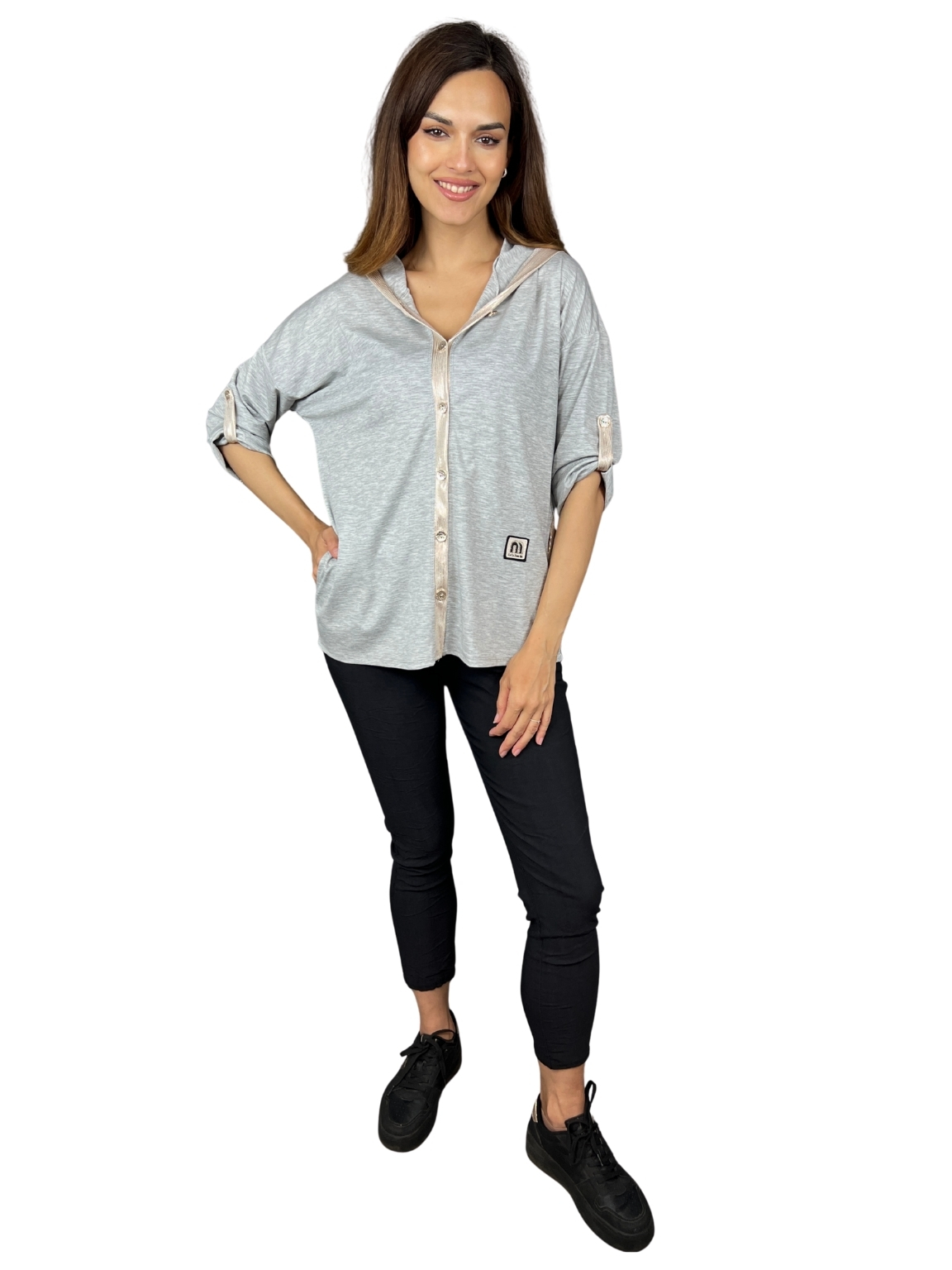 Styling tip: Noste ji rozepnutou přes top nebo tílko, případně samostatně jako ležérní tuniku. Skvěle ladí se sportovní obuví i espadrilkami.