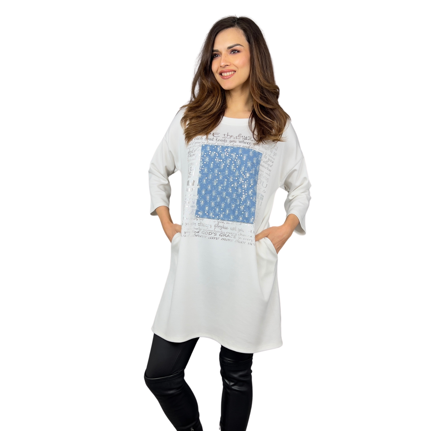 Mikinové šaty Defne spojují volný, moderní střih s ležérní elegancí. Díky dropshoulder rukávům a prodloužené délce jsou skvělou volbou pro ženy, které hledají pohodlí bez kompromisů ve stylu. Šaty zdobí originální potisk s denimovým efektem a třpytivými detaily, které dodávají celkovému vzhledu jedinečnost. Praktické boční kapsy zajišťují ještě větší komfort při nošení.