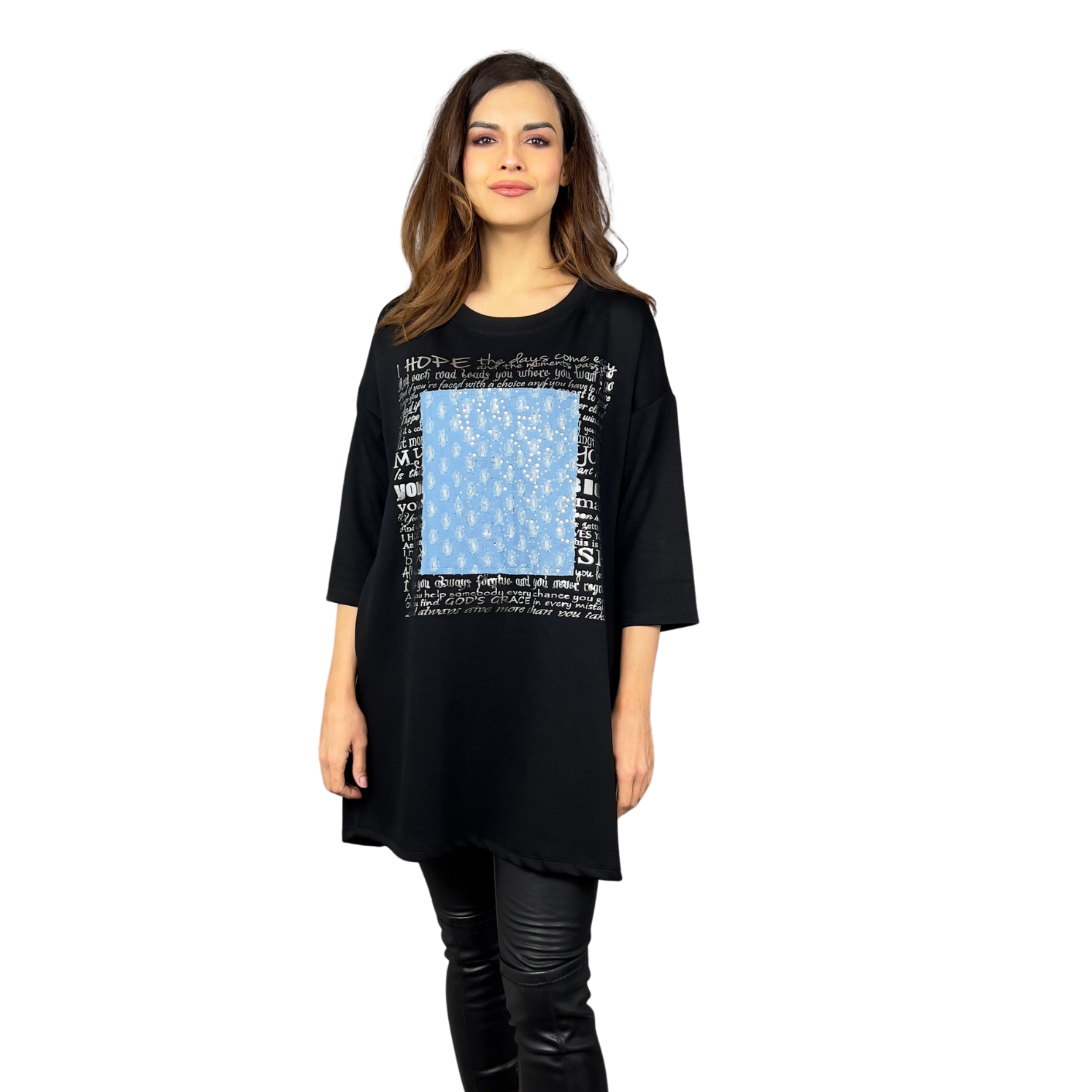 Mikinové šaty Defne spojují volný, moderní střih s ležérní elegancí. Díky dropshoulder rukávům a prodloužené délce jsou skvělou volbou pro ženy, které hledají pohodlí bez kompromisů ve stylu. Šaty zdobí originální potisk s denimovým efektem a třpytivými detaily, které dodávají celkovému vzhledu jedinečnost. Praktické boční kapsy zajišťují ještě větší komfort při nošení.
