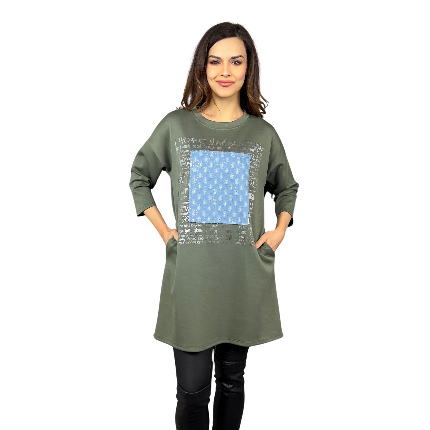 Mikinové šaty Defne spojují volný, moderní střih s ležérní elegancí. Díky dropshoulder rukávům a prodloužené délce jsou skvělou volbou pro ženy, které hledají pohodlí bez kompromisů ve stylu. Šaty zdobí originální potisk s denimovým efektem a třpytivými detaily, které dodávají celkovému vzhledu jedinečnost. Praktické boční kapsy zajišťují ještě větší komfort při nošení.