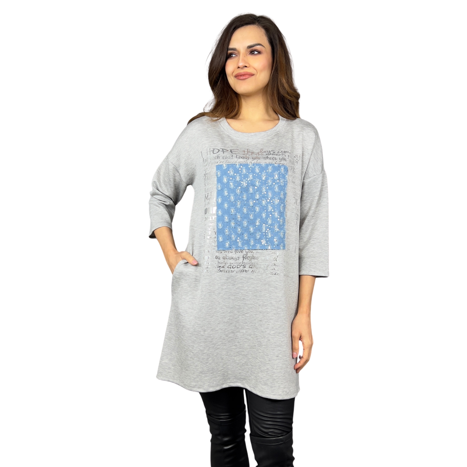 Mikinové šaty Defne spojují volný, moderní střih s ležérní elegancí. Díky dropshoulder rukávům a prodloužené délce jsou skvělou volbou pro ženy, které hledají pohodlí bez kompromisů ve stylu. Šaty zdobí originální potisk s denimovým efektem a třpytivými detaily, které dodávají celkovému vzhledu jedinečnost. Praktické boční kapsy zajišťují ještě větší komfort při nošení.